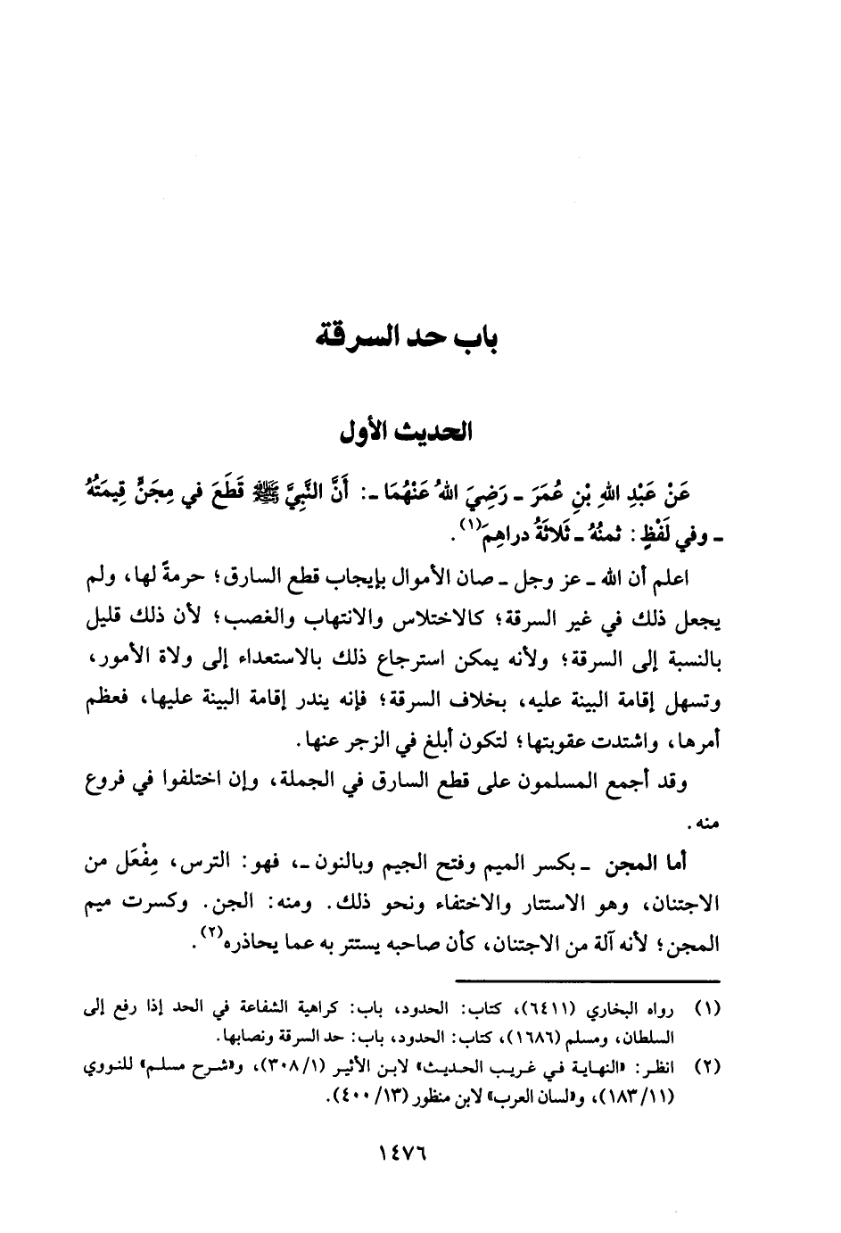 عَنْ عَبْدِ اللهِ بْنِ عُمَرَ -رَضِيَ اللهُ عَنْهُمَا-: أَن النَّبِيَّ - صلى الله عليه وسلم - قَطَعَ في مِجَنٍّ قِيمَتُهُ -وفي لَفظٍ: ثمنُهُ- ثَلاثَةُ دراهِمَ (¬1).