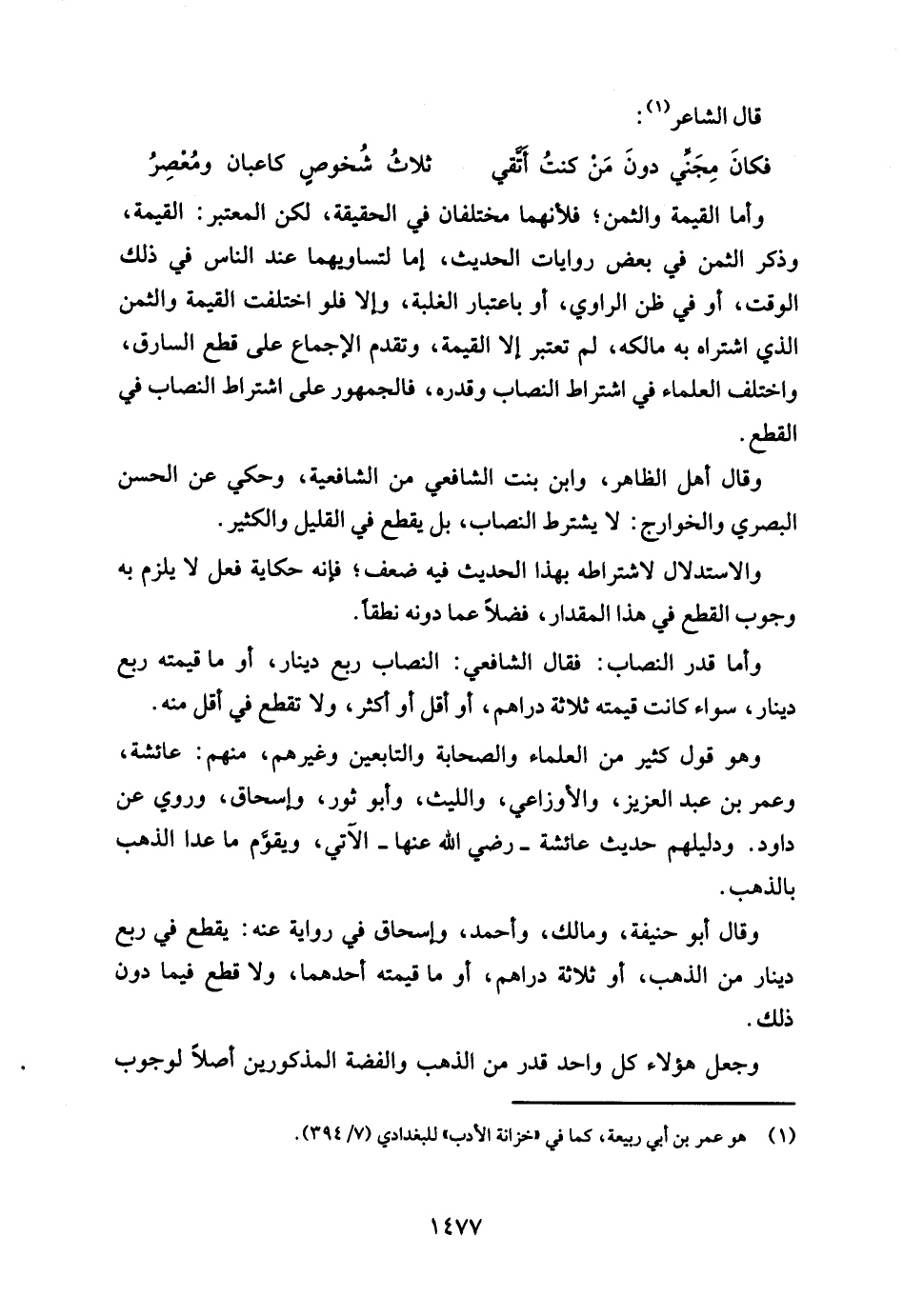 وأما القيمة والثمن؛ فلأنهما مختلفان في الحقيقة، لكن المعتبر: القيمة، وذكر الثمن في بعض روايات الحديث، إما لتساويهما عند الناس في ذلك الوقت، أو في ظن الراوي، أو باعتبار الغلبة، وإلا فلو اختلفت القيمة والثمن الذي اشتراه به مالكه، لم تعتبر إلا القيمة، وتقدم الإجماع على قطع السارق، واختلف العلماء في اشتراط النصاب وقدره، فالجمهور على اشتراط النصاب في القطع.
