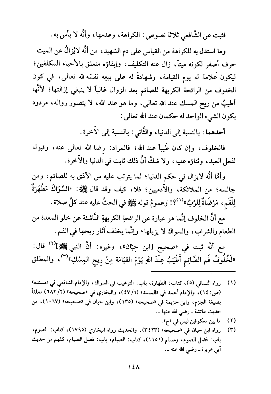 وما استدل به للكراهة من القياس على دم الشهيد، من أنَّه لا يُزالُ عن الميت حرف أصفر لكونه ميتًا، زال عنه التكليف، وإبقاؤه متعلق بالأحياء المكلفين؛ ليكون علامة له يوم القيامة، وشهادةً له على بيعِه نفسَه لله تعالى، في كون الخلوف من الرائحة الكريهة للصائم بعد الزوال غالبًا لا ينبغي إزالتها؛ لأنَّها أطيبُ من ريح المسك عند الله تعالى، وما هو عند الله، لا يتصور زواله، مردود بكون الشيء الواحد له حكمان عند الله تعالى:
