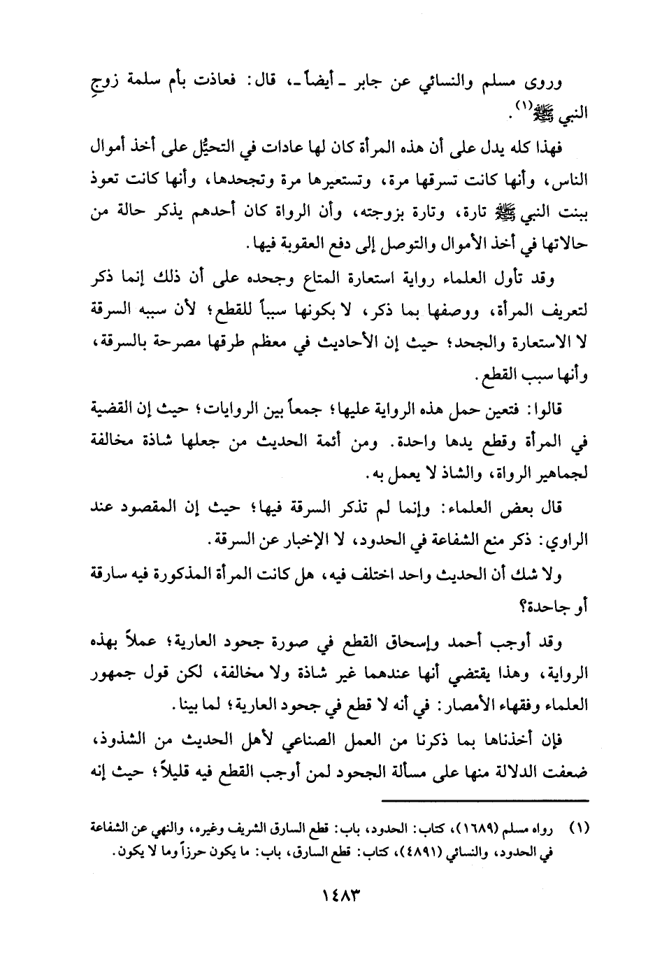 قالوا: فتعين حمل هذه الرواية عليها؛ جمعًا بين الروايات؛ حيث إن القضية في المرأة وقطع يدها واحدة. ومن أئمة الحديث من جعلها شاذة مخالفة لجماهير الرواة، والشاذ لا يعمل به.