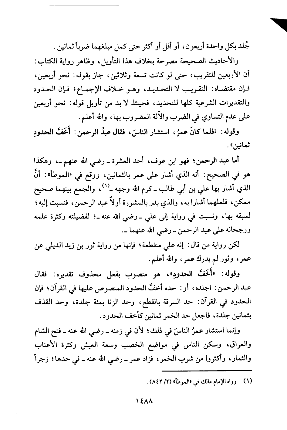 أما عبد الرحمن؛ فهو ابن عوف، أحد العشرة -رضي الله عنهم-، وهكذا هو في الصحيح: أنه الذي أشار على عمر بالثمانين، ووقع في "الموطأ": أنَّ الذي أشار بها علي بن أبي طالب- كرم الله وجهه - (¬1)، والجمع بينهما صحيح ممكن، فلعلهما أشارا به، والذي بدر بالمشورة أولًا عبد الرحمن، فنسبت إليه؛ لسبقه بها، ونسبت في رواية إلى علي - رضي الله عنه -؛ لفضيلته وكثرة علمه ورجحانه على عبد الرحمن - رضي الله عنهما -.
