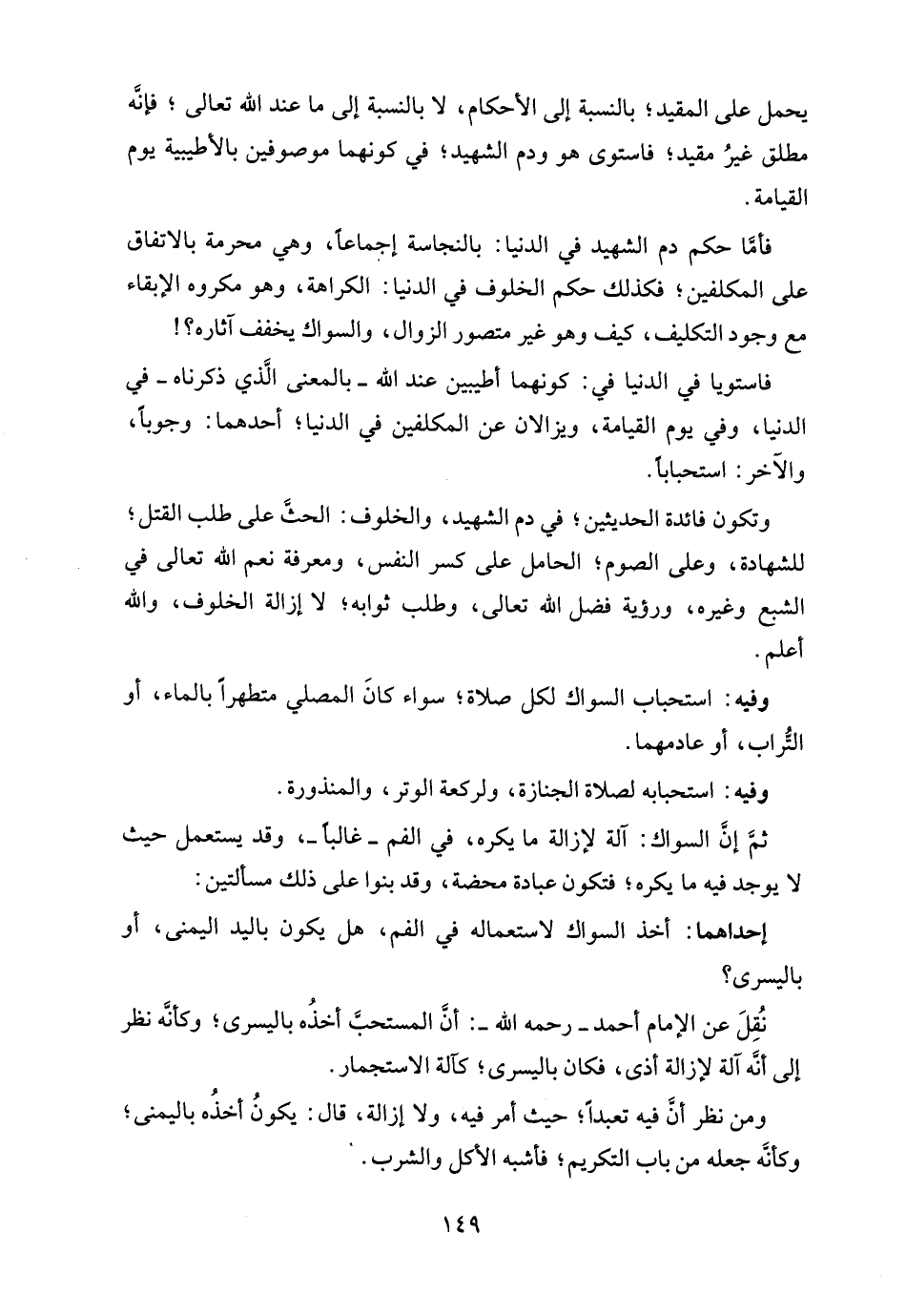 فأمَّا حكم دم الشهيد في الدنيا: بالنجاسة إجماعًا، وهي محرمة بالاتفاق على المكلفين؛ فكذلك حكم الخلوف في الدنيا: الكراهة، وهو مكروه الإبقاء مع وجود التكليف، كيف وهو غير متصور الزوال، والسواك يخفف آثاره؟!