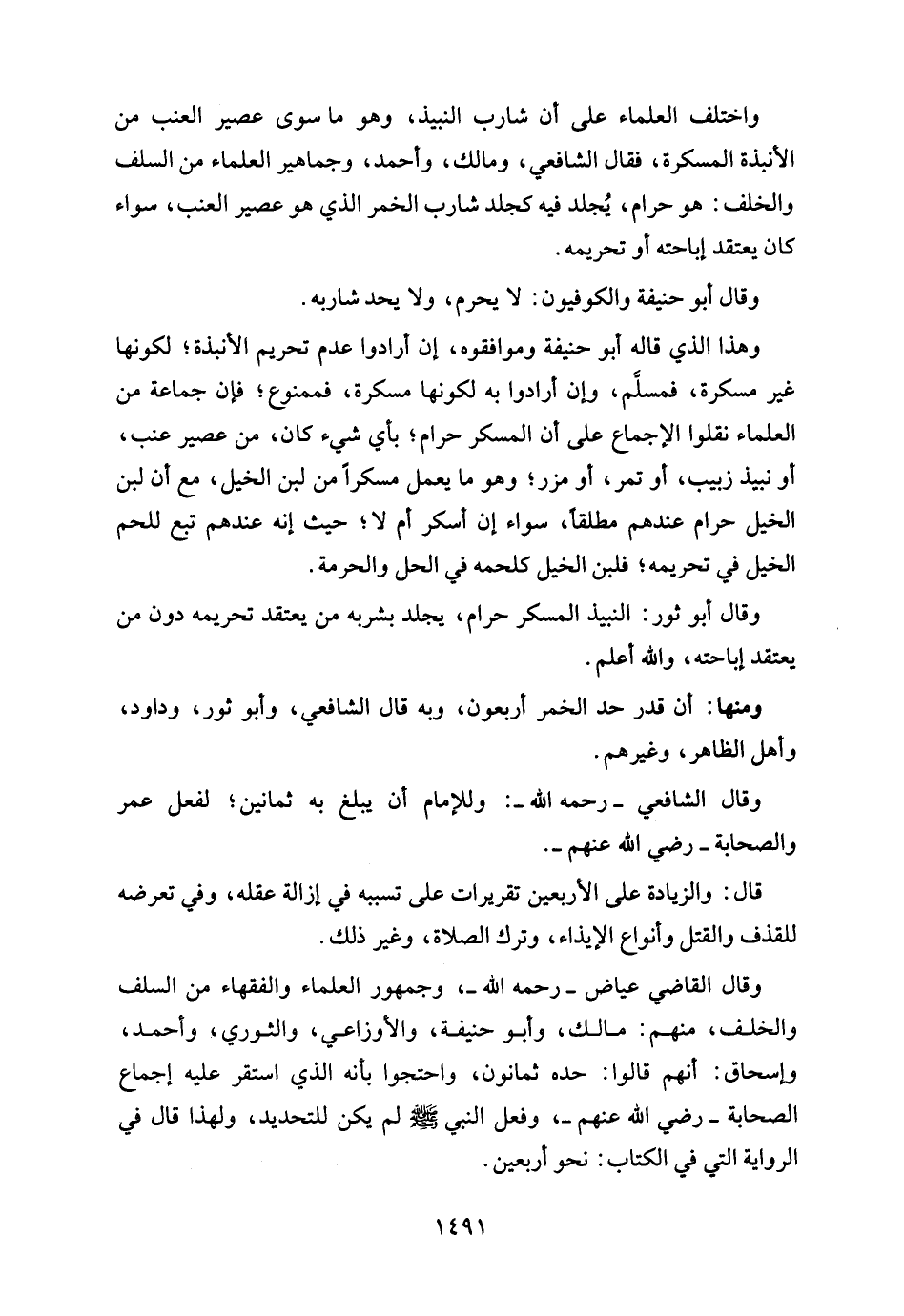 واختلف العلماء على أن شارب النبيذ، وهو ما سوى عصير العنب من الأنبذة المسكرة، فقال الشافعي، ومالك، وأحمد، وجماهير العلماء من السلف والخلف: هو حرام، يُجلد فيه كجلد شارب الخمر الذي هو عصير العنب، سواء كان يعتقد إباحته أو تحريمه.