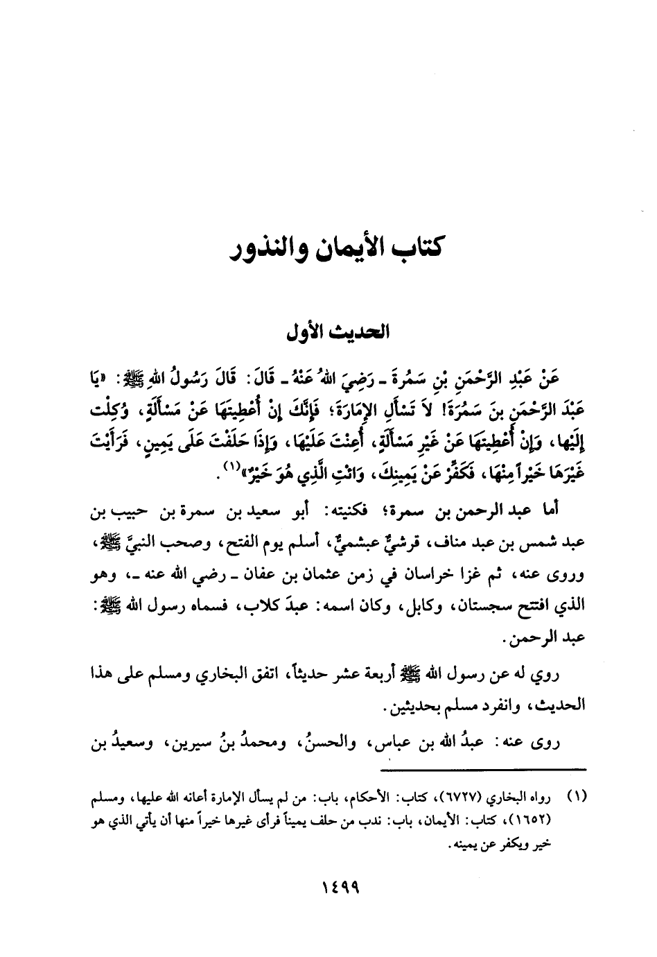 عَنْ عَبْدِ الرَّحْمَنِ بْنِ سَمُرةَ -رَضِيَ اللهُ عَنْهُ- قَالَ: قَالَ رَسُولُ اللهِ - صلى الله عليه وسلم -: "يَا عَبْدَ الرَّحْمَنِ بنَ سَمُرَةَ! لَا تَسْأَلِ الإِمَارَة؛ فَإِنَّكَ إِنْ أُعْطِيتَهَا عَنْ مَسْأَلَةٍ، وُكِلْت إلَيْها، وَإِنْ أُعْطِيتَهَا عَنْ غَيْرِ مَسْأَلةٍ، أُعِنْتَ عَلَيْهَا، وَإِذَا حَلَفْتَ عَلَى يَمِينٍ، فَرَأَيْتَ غَيْرَهَا خَيْرًا مِنْهَا، فكَفِّر عَنْ يَمِينِكَ، وَائتِ الَّذِي هُوَ خَيْرٌ" (¬1).