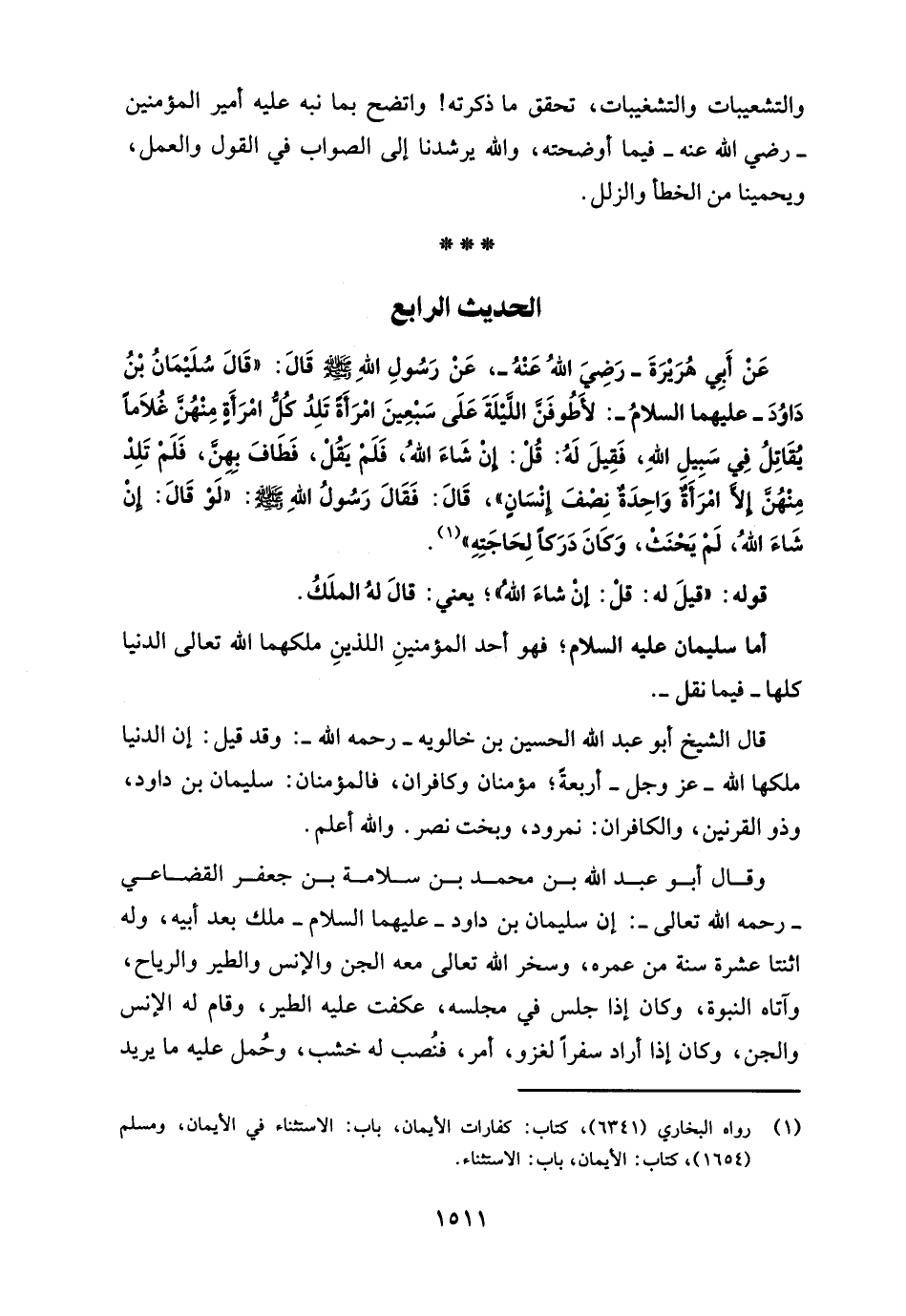 عَن أَبِي هُرَيْرَةَ -رَضِيَ اللهُ عَنْهُ-، عَنْ رَسُولِ اللهِ - صلى الله عليه وسلم - قَالَ: "قَالَ سُلَيْمَانُ بْنُ دَاوُدَ -عليهما السلامُ-: لأَطُوفَنَّ الليلَةَ عَلَى سَبْعِينَ امْرَأةً تَلِدُ كُل امْرَأَةِ مِنْهُنَّ غُلَامًا يُقاتِلُ في سَبِيلِ اللهِ، فَقِيلَ لَهُ: قُلْ: إنْ شَاءَ اللهُ، فَلَمْ يَقُلْ، فَطَافَ بِهِنَّ، فَلَمْ تَلِدْ مِنْهُنَّ إلَّا امْرَأَةٌ وَاحِدَةٌ نِصْفَ إنْسَانٍ"، قَالَ: فَقَالَ رَسُولُ اللهِ - صلى الله عليه وسلم -: "لَوْ قَالَ: إنْ شَاءَ اللهُ، لَمْ يَحْنَثْ، وَكَانَ دَرَكًا لِحَاجَتِهِ" (¬1).