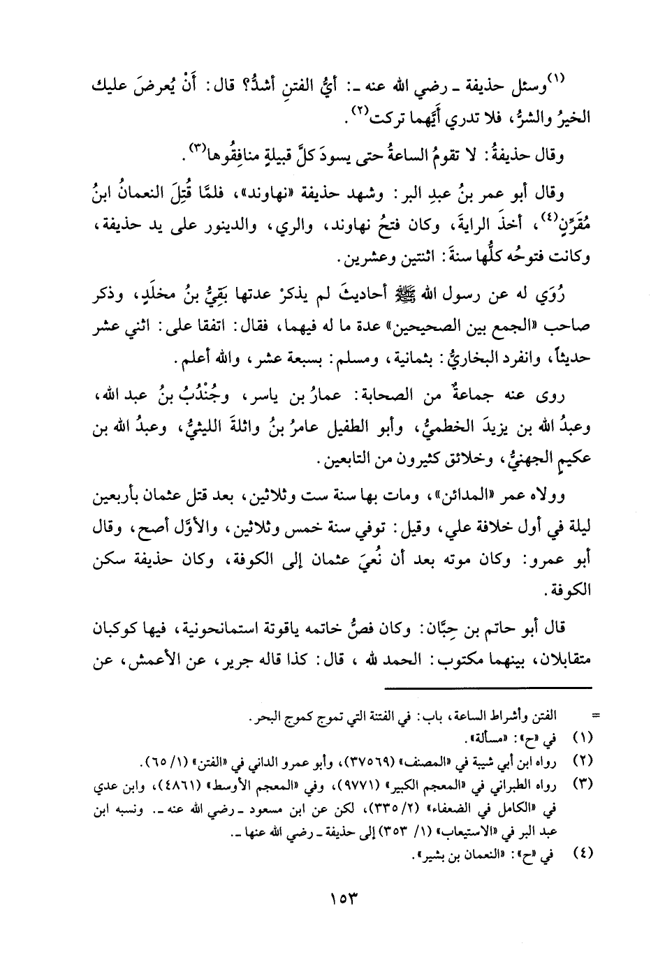 وقال أبو عمر بنُ عبدِ البر: وشهد حذيفة "نهاوند"، فلمَّا قُتِلَ النعمانُ ابنُ مُقَرِّنٍ (¬4)، أخذَ الرايةَ، وكان فتحُ نهاوند، والري، والدينور على يد حذيفة، وكانت فتوحُه كلُّها سنةَ: اثنتين وعشرين.