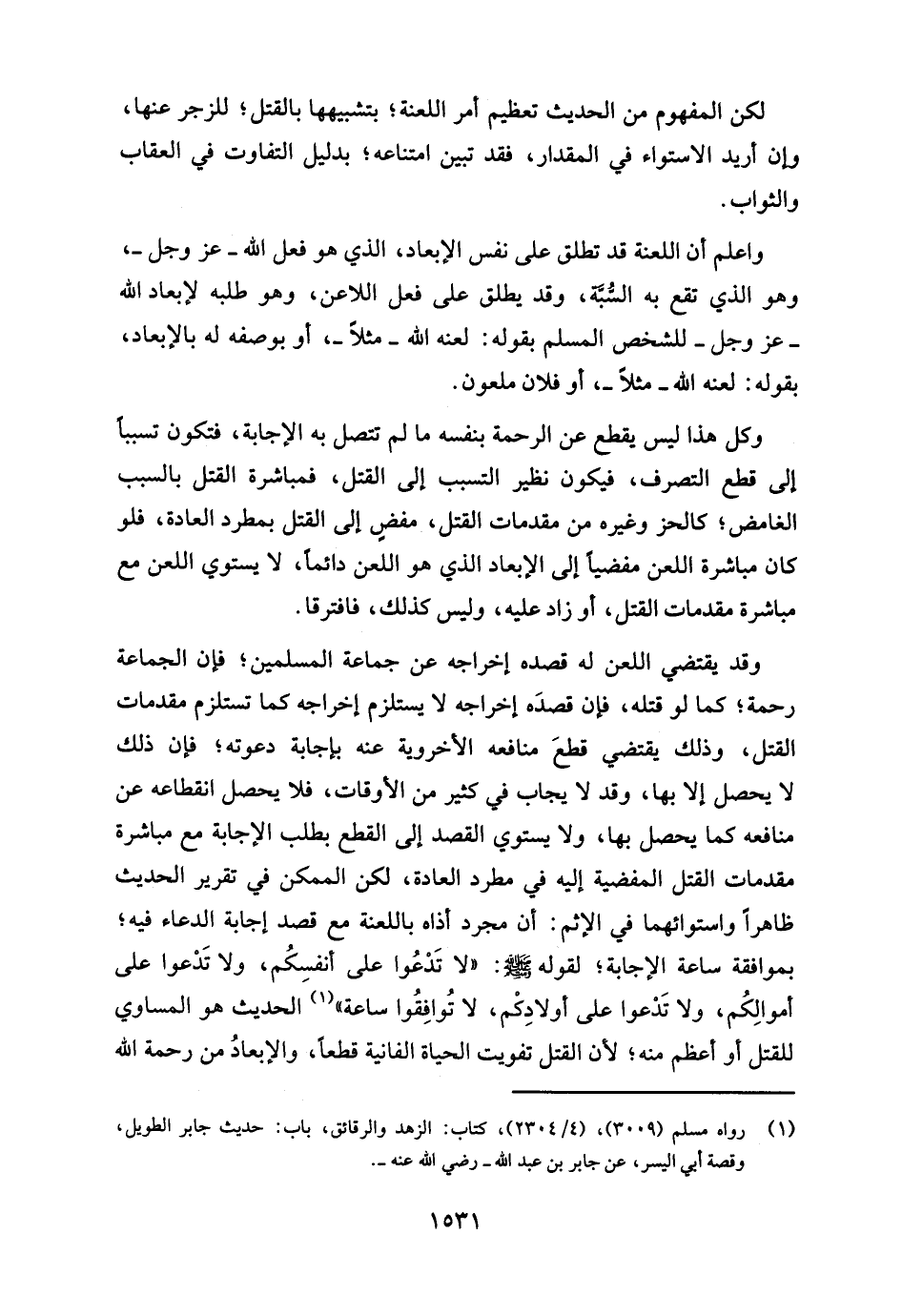 وقد يقتضي اللعن له قصده إخراجه عن جماعة المسلمين؛ فإن الجماعة رحمة؛ كما لو قتله، فإن قصدَه إخراجه لا يستلزم إخراجه كما تستلزم مقدمات القتل، وذلك يقتضي قطعَ منافعه الأخروية عنه بإجابة دعوته؛ فإن ذلك لا يحصل إلَّا بها، وقد لا يجاب في كثير من الأوقات، فلا يحصل انقطاعه عن منافعه كما يحصل بها، ولا يستوي القصد إلى القطع بطلب الإجابة مع مباشرة مقدمات القتل المفضية إليه في مطرد العادة، لكن الممكن في تقرير الحديث ظاهرًا واستوائهما في الإثم: أن مجرد أذاه باللعنة مع قصد إجابة الدعاء فيه؛ بموافقة ساعة الإجابة؛ لقوله - صلى الله عليه وسلم -: "لا تَدْعُوا على أنفسِكم، ولا تَدْعوا على أموالِكم، ولا تَدْعوا على أولادِكْم، لا توافِقوا ساعة" (¬1) الحديث هو المساوي للقتل أو أعظم منه؛ لأن القتل تفويت الحياة الفانية قطعًا، والإبعاد من رحمة الله