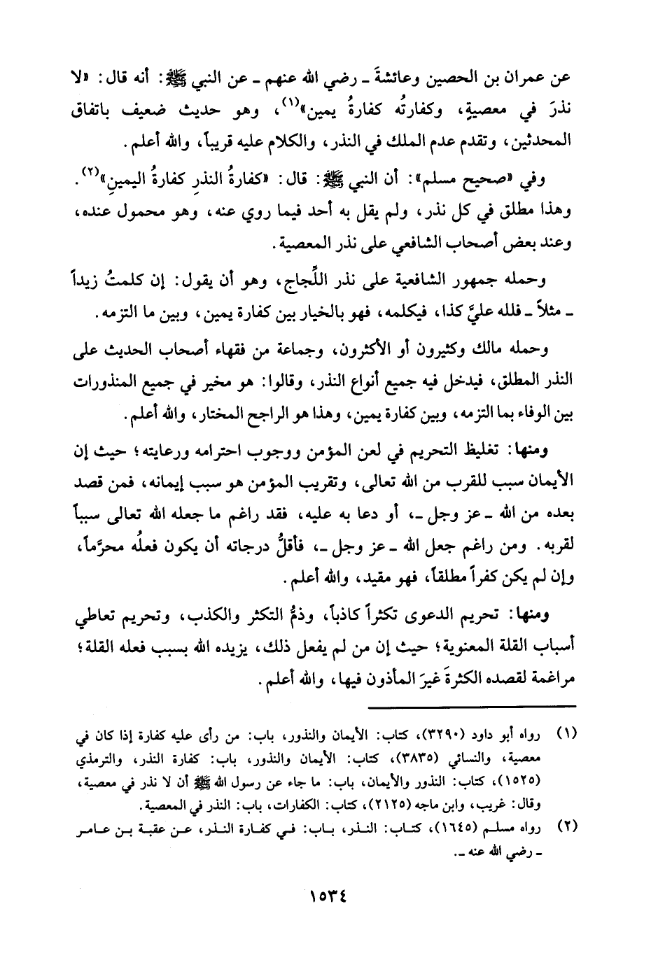 (¬1) رواه أبو داود (3290)، كتاب: الأيمان والنذور، باب: من رأى عليه كفارة إذا كان في معصية، والنَّسائيّ (3835)، كتاب: الأيمان والنذور، باب: كفارة النذر، والتِّرمذيّ (1525)، كتاب: النذور والأيمان، باب: ما جاء عن رسول الله - صلى الله عليه وسلم - أن لا نذر في معصية، وقال: غريب، وابن ماجه (2125)، كتاب: الكفارات، باب: النذر في المعصية.