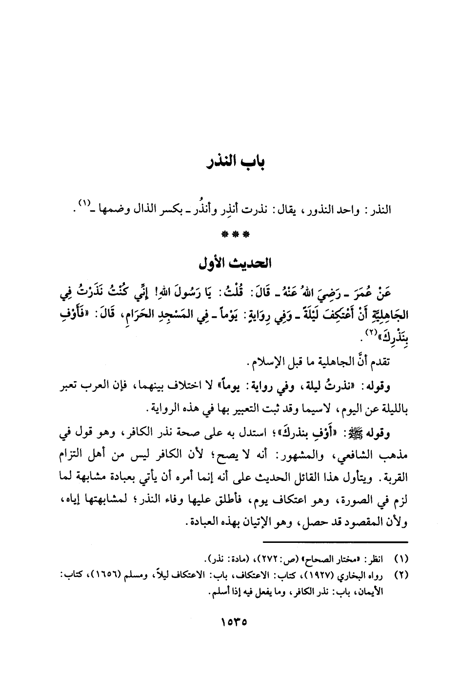 عَنْ عُمَرَ -رَضِيَ الله عَنْهُ- قَالَ: قُلْتُ: يَا رَسُولَ اللهِ! إنِّي كنتُ نَذَرْتُ في الجَاهِلِيّةِ أَنْ أَعْتكفَ لَيْلَةً -وَفِي رِوَايةٍ: يَوْمًا- في المَسْجِدِ الحَرَامِ، قَالَ: "فَأَوْفِ بِنَذْرِكَ" (¬2).