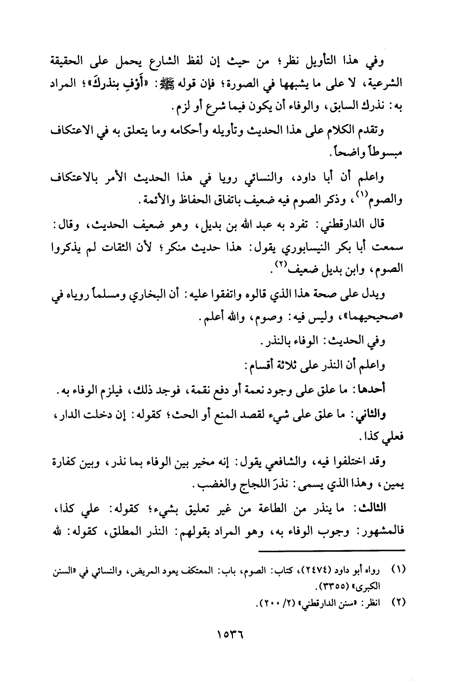 وفي هذا التأويل نظر؛ من حيث إن لفظ الشارع يحمل على الحقيقة الشرعية، لا على ما يشبهها في الصورة؛ فإن قوله - صلى الله عليه وسلم -: "أَوْفِ بنذركَ"؛ المراد به: نذرك السابق، والوفاء أن يكون فيما شرع أو لزم.