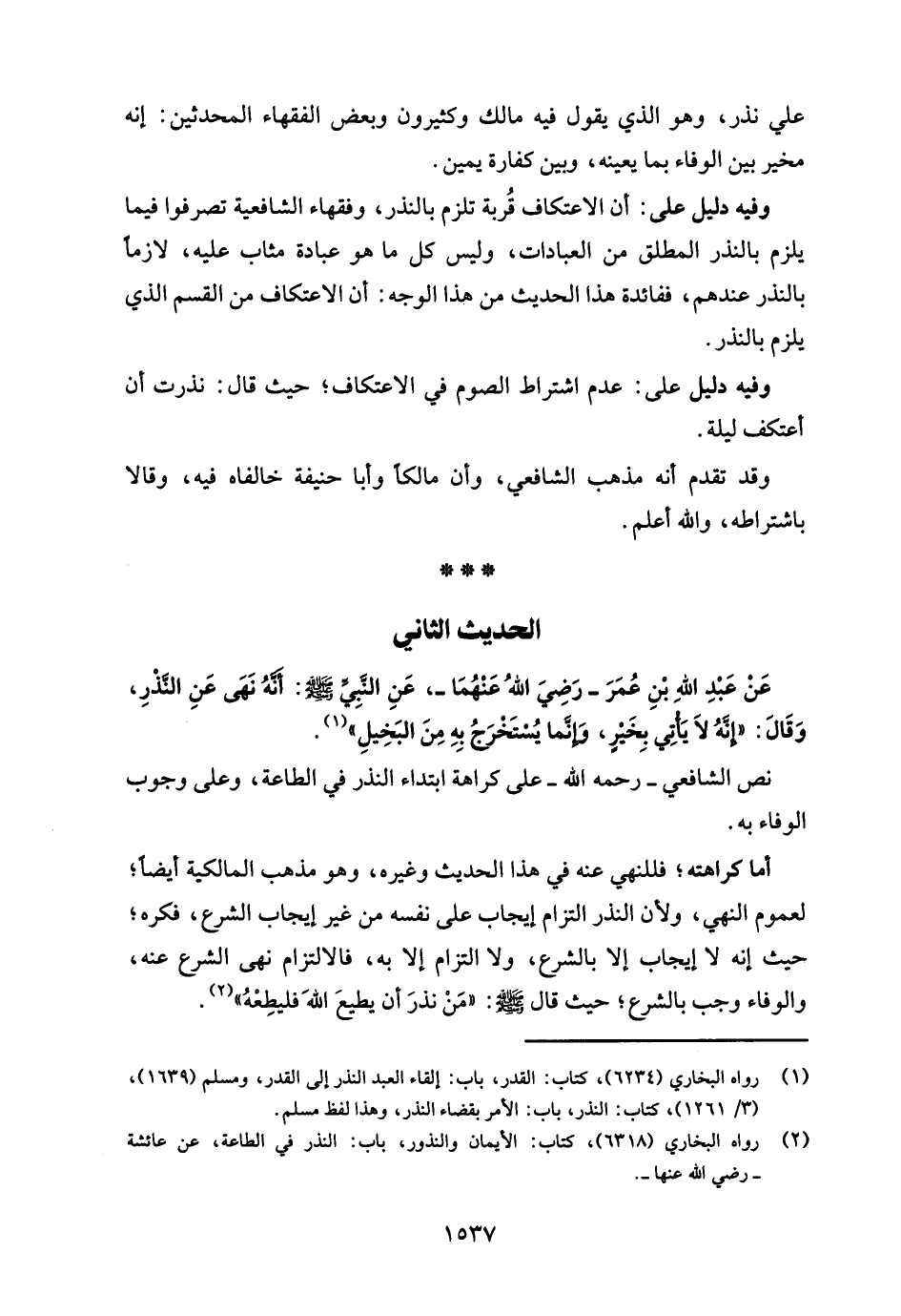 (¬1) رواه البُخَارِيّ (6234)، كتاب: القدر، باب: إلقاء العبد النذر إلى القدر، ومسلم (1639)، (3/ 1261)، كتاب: النذر، باب: الأمر بقضاء النذر، وهذا لفظ مسلم.