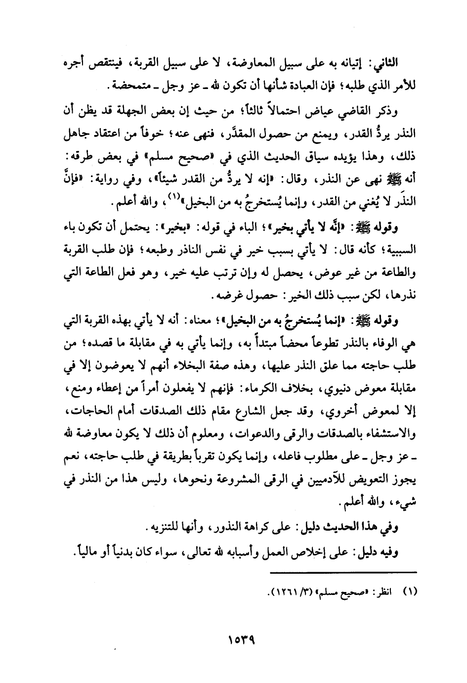 وقوله - صلى الله عليه وسلم -: "إنما يُستخرجُ به من البخيل"، معناه: أنَّه لا يأتي بهذه القربة التي هي الوفاء بالنذر تطوعًا محضًا مبتدأَ به، وإنما يأتي به في مقابلة ما قصده؛ من طلب حاجته مما علق النذر عليها، وهذه صفة البخلاء أنَّهم لا يعوضون إلَّا في مقابلة معوض دنيوي، بخلاف الكرماء: فإنهم لا يفعلون أمرًا من إعطاء ومنع، إلَّا لمعوض أخروي، وقد جعل الشارع مقام ذلك الصدقات أمام الحاجات، والاستشفاء بالصدقات والرقى والدعوات، ومعلوم أن ذلك لا يكون معاوضة لله -عَزَّ وَجَلَّ- على مطلوب فاعله، وإنما يكون تقربًا بطريقة في طلب حاجته، نعم يجوز التعويض للآدميين في الرقى المشروعة ونحوها، وليس هذا من النذر في شيء، والله أعلم.