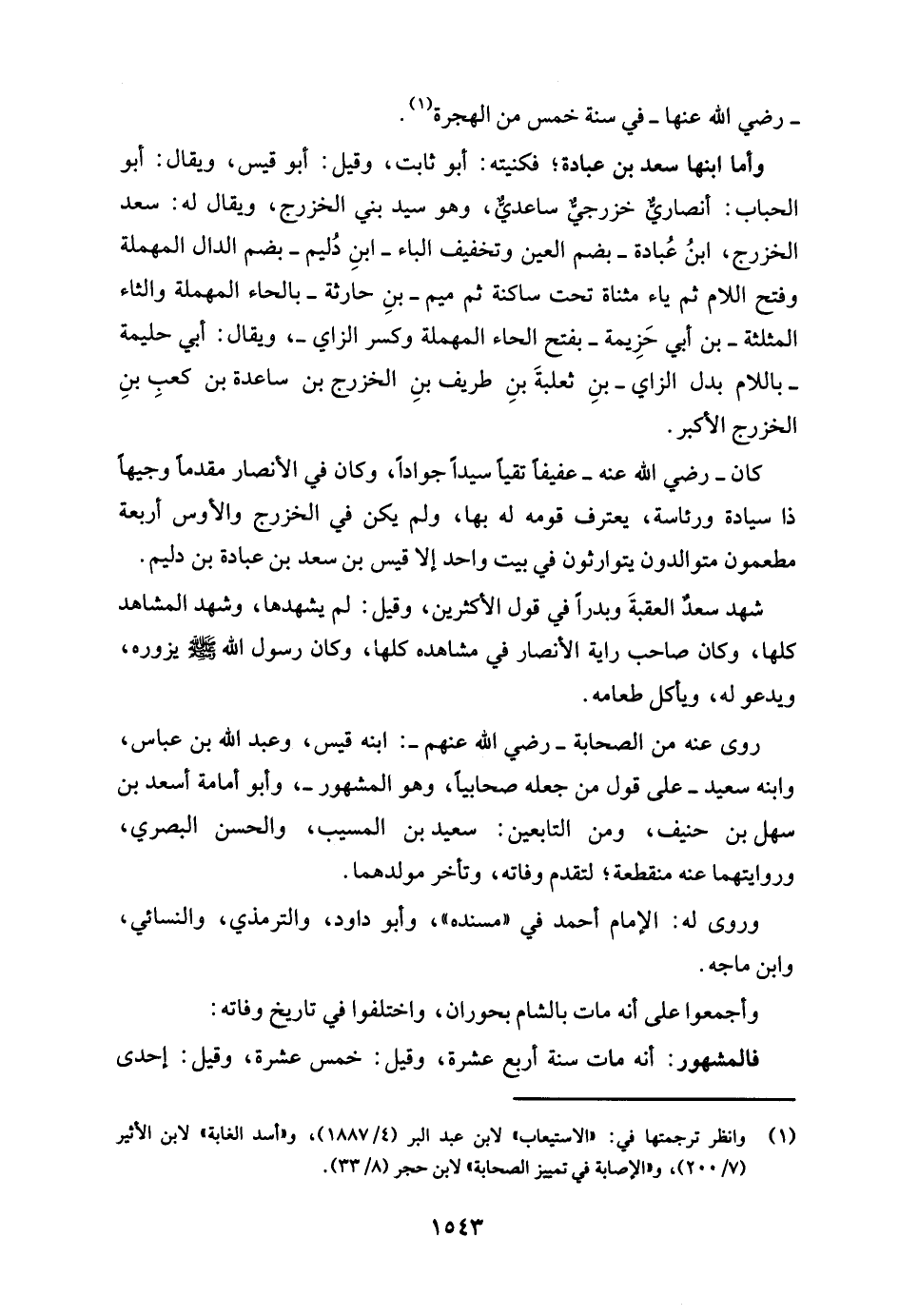 وأما ابنها سعد بن عبادة؛ فكنيته: أبو ثابت، وقيل: أبو قيس، ويقال: أبو الحباب: أنصاريٌّ خزرجيٌّ ساعديٌّ، وهو سيد بني الخزرج، ويقال له: سعد الخزرج، ابن عُبادة -بضم العين وتخفيف الباء- ابنِ دُليم -بضم الدال المهملة وفتح اللام ثم ياء مثناة تحت ساكنة ثم ميم- بنِ حارثة- بالحاء المهملة والثاء المثلثة- بن أبي حَزِيمة -بفتح الحاء المهملة وكسر الزاي-، ويقال: أبي حليمة -باللام بدل الزاي- بنِ ثعلبةَ بنِ طريف بنِ الخزرج بن ساعدة بن كعبِ بنِ الخزرج أكبر.