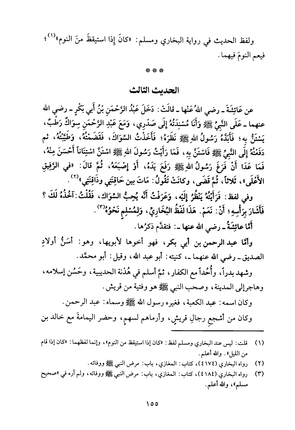 عن عَائشِةَ - رضي اللهُ عَنْها - قالَتْ: دَخَلَ عَبْدُ الرَّحْمَنِ بْنُ أَبي بَكْرٍ - رضي الله عنهما - عَلَى النَّبِيِّ - صلى الله عليه وسلم - وَأَنَا مُسْنِدَتُهُ إلَى صدْرِي، وَمَعَ عَبْدِ الرَّحْمَنِ سِوَاكٌ رَطْبٌ، يَسْتَنُّ بِه؛ فَأَبَدَّهُ رَسُولُ اللهِ - صلى الله عليه وسلم - نَظَرَهُ؛ فَأَخَذْتُ السِّوَاكَ، فَقَضَمْتُهُ، وَطَيَّبْتُهُ، ثم دَفَعْتُهُ إِلَى النَّبِيِّ - صلى الله عليه وسلم - فَاسْتَنَّ بِهِ، فَمَا رَأَيْتُ رَسُولَ اللهِ - صلى الله عليه وسلم - اسْتَنَّ اسْتِنَانًا أَحْسَنَ مِنْهُ، فَمَا عَدَا أَنْ فَرَغَ رَسُولُ اللهِ - صلى الله عليه وسلم - رَفَعَ يَدَهُ، أَوْ إصْبَعَهُ، ثُمَّ قالَ: "في الرَّفِيقِ الأَعْلَى"، ثَلاثًا، ثُمَّ قَضَى، وكانَتْ تَقُولُ: مَاتَ بين حَاقِنَتِي وذَاقِنَتِي" (¬2).