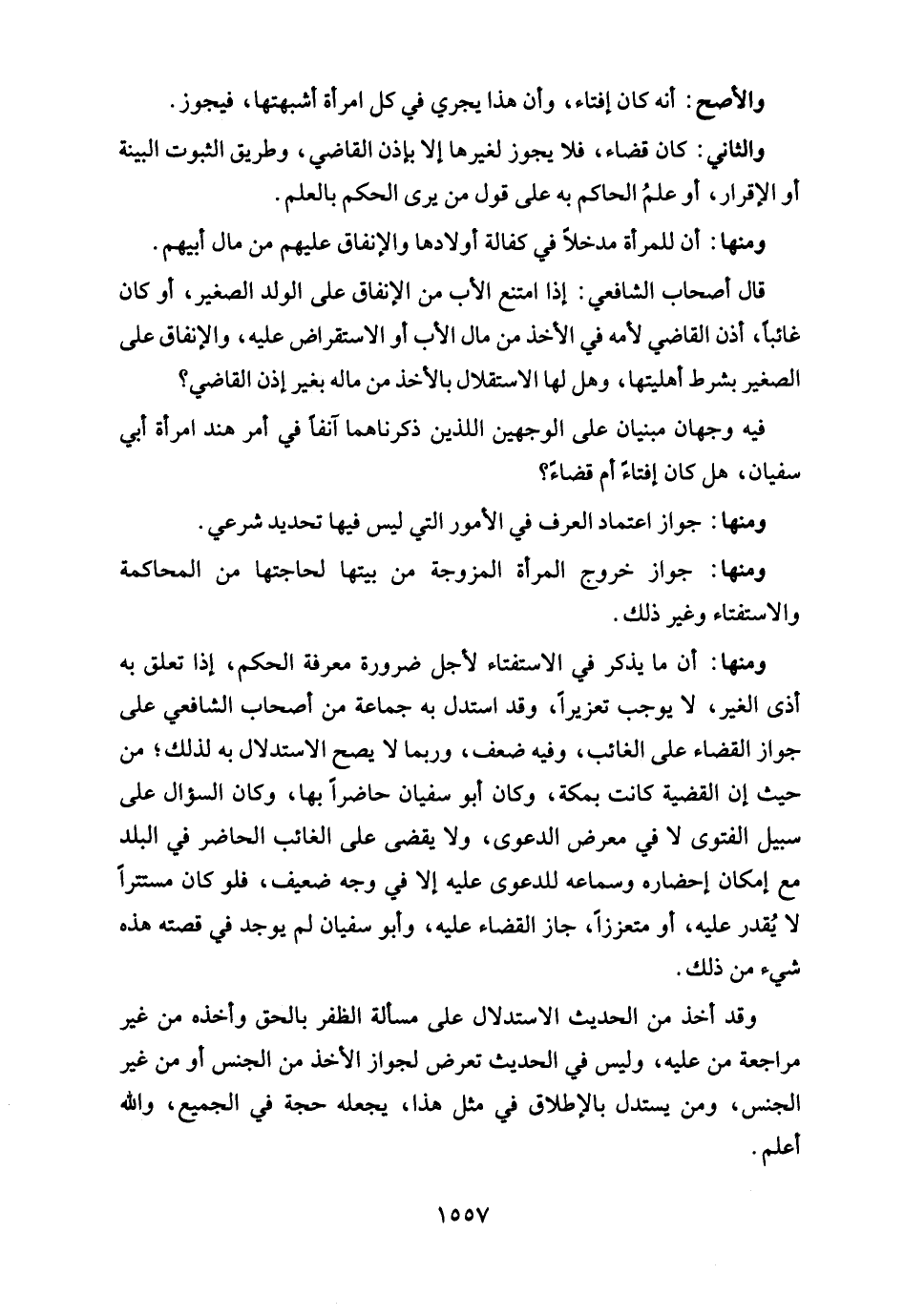 ومنها: أن ما يذكر في الاستفتاء لأجل ضرورة معرفة الحكم، إذا تعلق به أذى الغير، لا يوجب تعزيرًا، وقد استدل به جماعة من أصحاب الشافعي على جواز القضاء على الغائب، وفيه ضعف، وربما لا يصح الاستدلال به لذلك؛ من حيث إن القضية كانت بمكة، وكان أبو سفيان حاضرًا بها، وكان السؤال على سبيل الفتوى لا في معرض الدعوى، ولا يقضى على الغائب الحاضر في البلد مع إمكان إحضاره وسماعه للدعوى عليه إلا في وجه ضعيف، فلو كان مستترًا لا يُقدر عليه، أو متعززًا، جاز القضاء عليه، وأبو سفيان لم يوجد في قصته هذه شيء من ذلك.