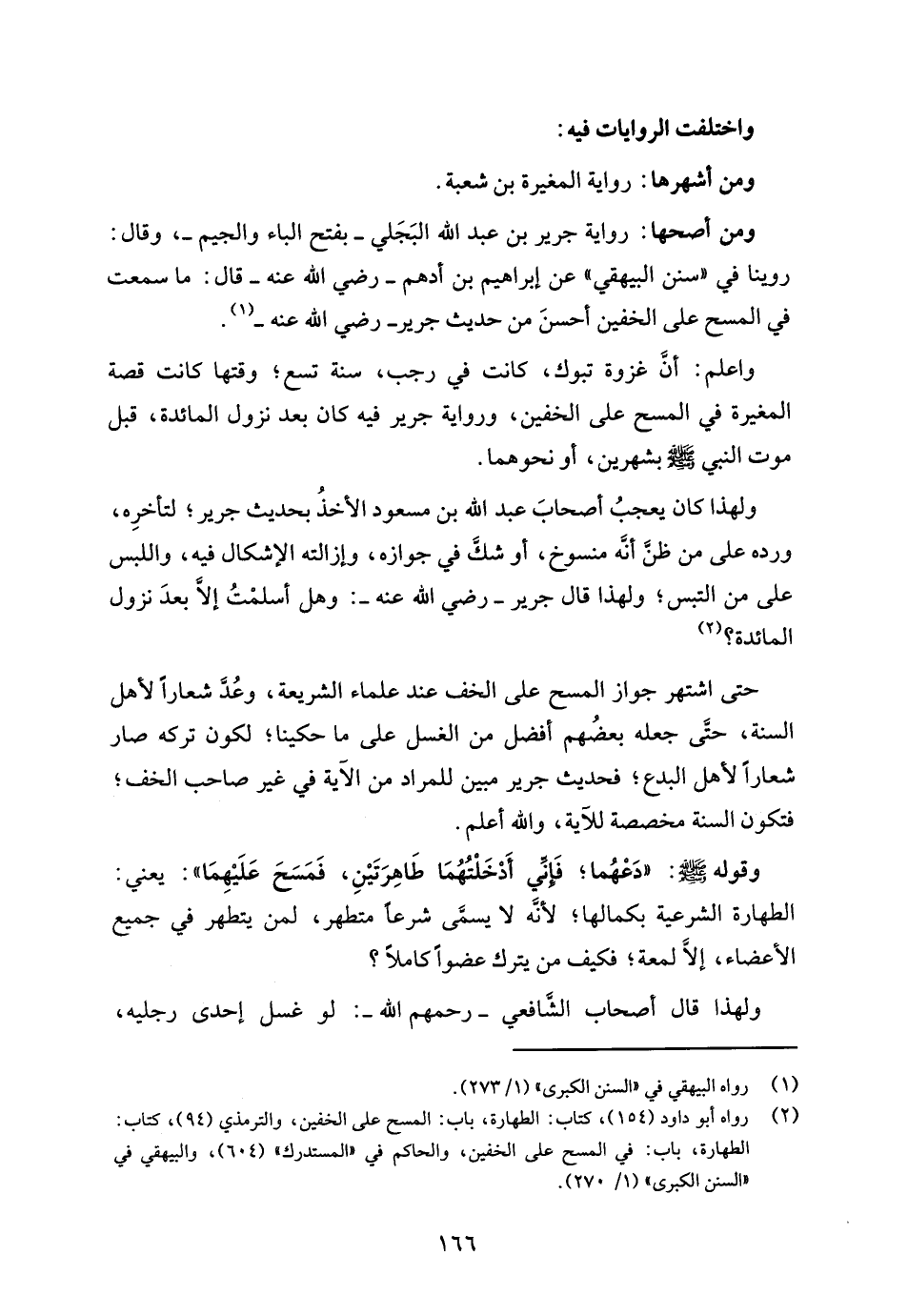 واعلم: أنَّ غزوة تبوك، كانت في رجب، سنة تسع؛ وقتها كانت قصة المغيرة في المسح على الخفين، ورواية جرير فيه كان بعد نزول المائدة، قبل موت النبي - صلى الله عليه وسلم - بشهرين، أو نحوهما.