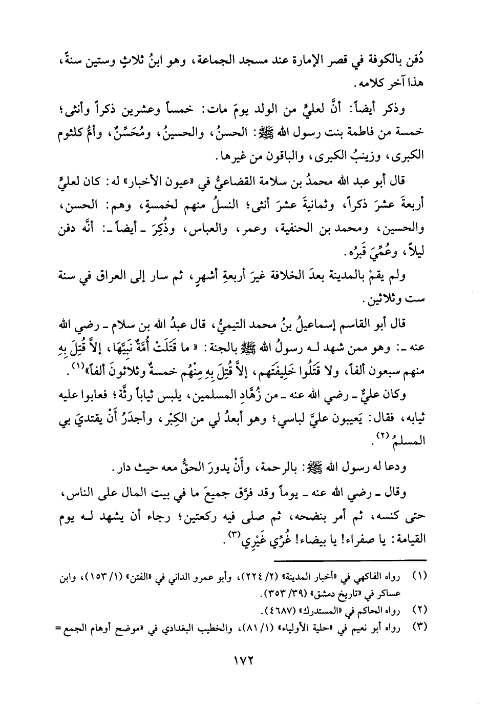 وذكر أيضًا: أنَّ لعليٍّ من الولد يومَ مات: خمسًا وعشرين ذكرًا وأنثى؛ خمسة من فاطمة بنت رسول الله - صلى الله عليه وسلم -: الحسنُ، والحسينُ، ومُحَسِّنٌ، وأمُّ كلثوم الكبرى، وزينبُ الكبرى، والباقون من غيرها.