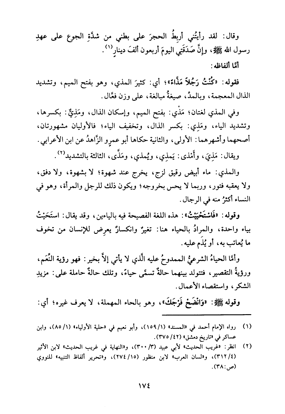 فقوله: "كُنْتُ رَجُلًا مَذّاءً"؛ أي: كثيرَ المذي، وهو بفتح الميم، وتشديد الذال المعجمة، وبالمدِّ، صيغةُ مبالغة، على وزن فعَّال.