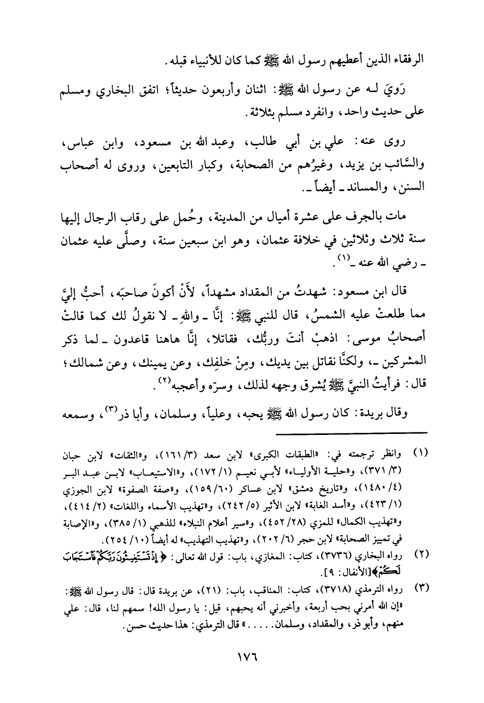 قال ابن مسعود: شهدتُ من المقداد مشهدًا، لأَنْ أكونَ صاحبَه، أحبُّ إلَيَّ مما طلعتْ عليه الشمسُ، قال للنبي - صلى الله عليه وسلم -: إنَّا -واللهِ- لا نقولُ لك كما قالتْ أصحابُ موسى: اذهبْ أنتَ وربُّك، فقاتلا، إنَّا هاهنا قاعدون -لما ذكر المشركين-، ولكنَّا نقاتل بين يديك، ومِنْ خلفِك، وعن يمينك، وعن شمالك؛ قال: فرأيتُ النبيَّ - صلى الله عليه وسلم - يُشرق وجهه لذلك، وسرّه وأعجبه (¬2).