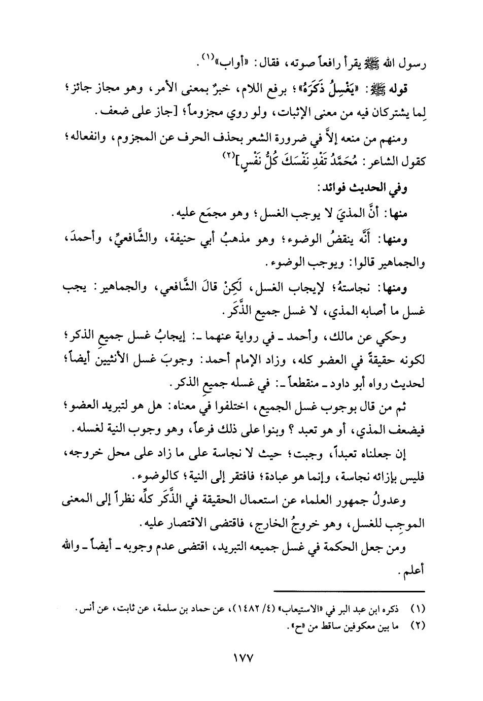 قوله - صلى الله عليه وسلم -: "يَغْسِلُ ذَكَرَهُ"؛ برفع اللام، خبرٌ بمعنى الأمر، وهو مجاز جائز؛ لِما يشتركان فيه من معنى الإثبات، ولو روي مجزومًا؛ [جاز على ضعف.