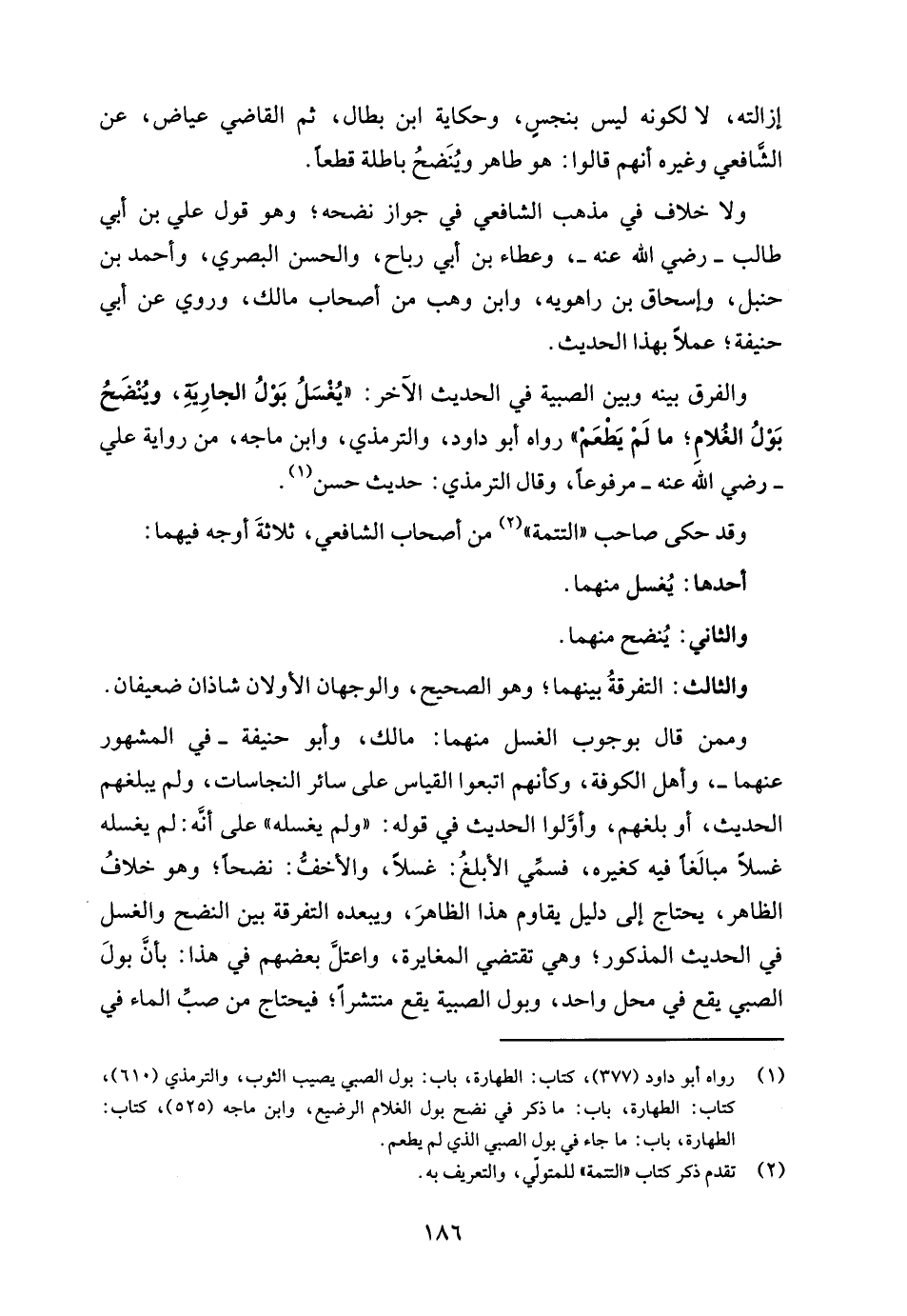 (¬1) رواه أبو داود (377)، كتاب: الطهارة، باب: بول الصبي يصيب الثوب، والترمذي (610)، كتاب: الطهارة، باب: ما ذكر في نضح بول الغلام الرضيع، وابن ماجه (525)، كتاب: الطهارة، باب: ما جاء في بول الصبي الَّذي لم يطعم.