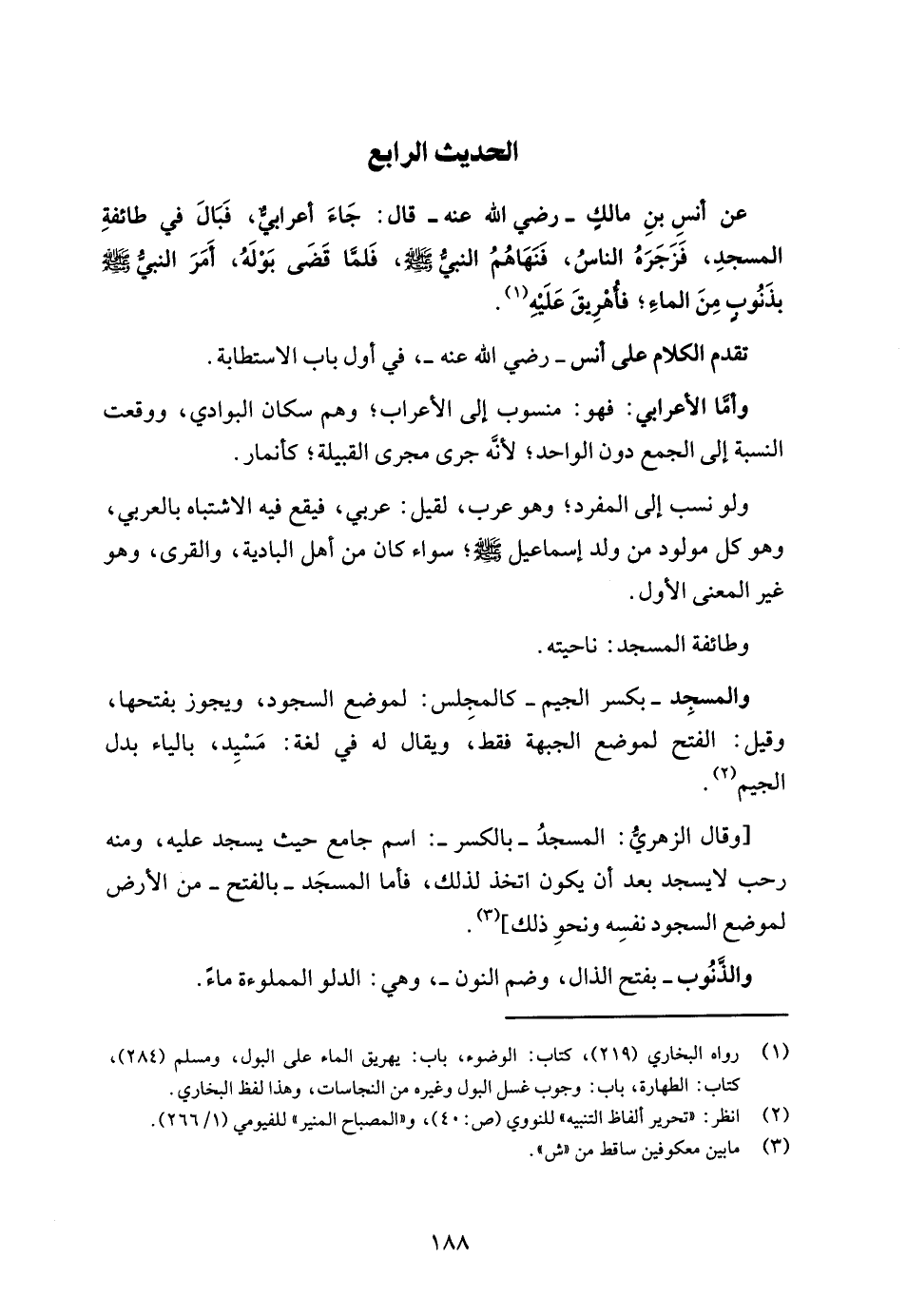 عن أنسِ بنِ مالكٍ - رضي الله عنه - قال: جَاءَ أعرابيٌّ، فَبَالَ في طائفةِ المسجدِ، فَزَجَرَهُ النَّاسُ، فَنَهَاهُمُ النبيُّ - صلى الله عليه وسلم -، فَلمَّا قَضَى بَوْلَهُ، أَمَرَ النبيُّ - صلى الله عليه وسلم - بذَنُوبٍ مِنَ الماءِ؛ فأُهْرِيقَ عَلَيْهِ (¬1).