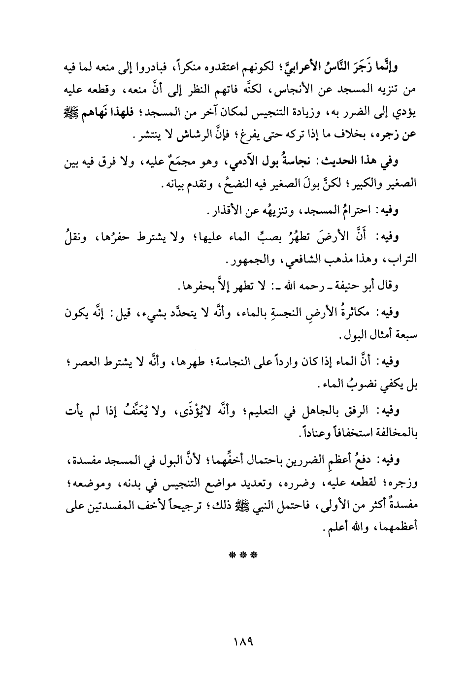 وفيه: دفعُ أعظمِ الضررين باحتمال أخفِّهما؛ لأنَّ البول في المسجد مفسدة، وزجره؛ لقطعه عليه، وضرره، وتعديد مواضع التنجيس في بدنه، وموضعه؛ مفسدةٌ أكثر من الأولى، فاحتمل النبي - صلى الله عليه وسلم - ذلك؛ ترجيحًا لأخف المفسدتين على أعظمهما، والله أعلم.