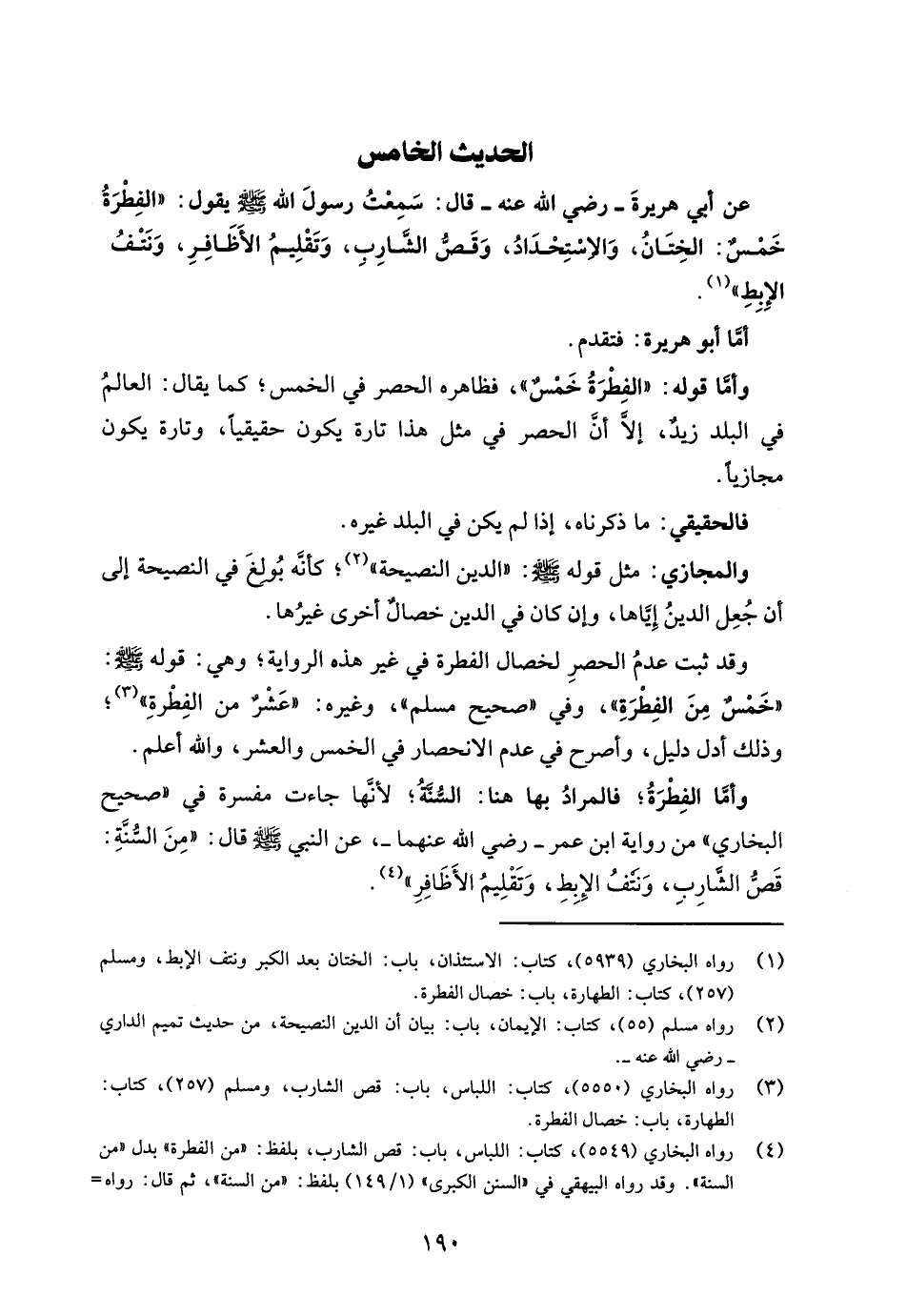 وأمَّا قوله: "الفِطْرَةُ خَمْسٌ"، فظاهره الحصر في الخمس؛ كما يقال: العالمُ في البلد زيدٌ، إلا أنَّ الحصر في مثل هذا تارة يكون حقيقيًّا، وتارة يكون مجازيًّا.