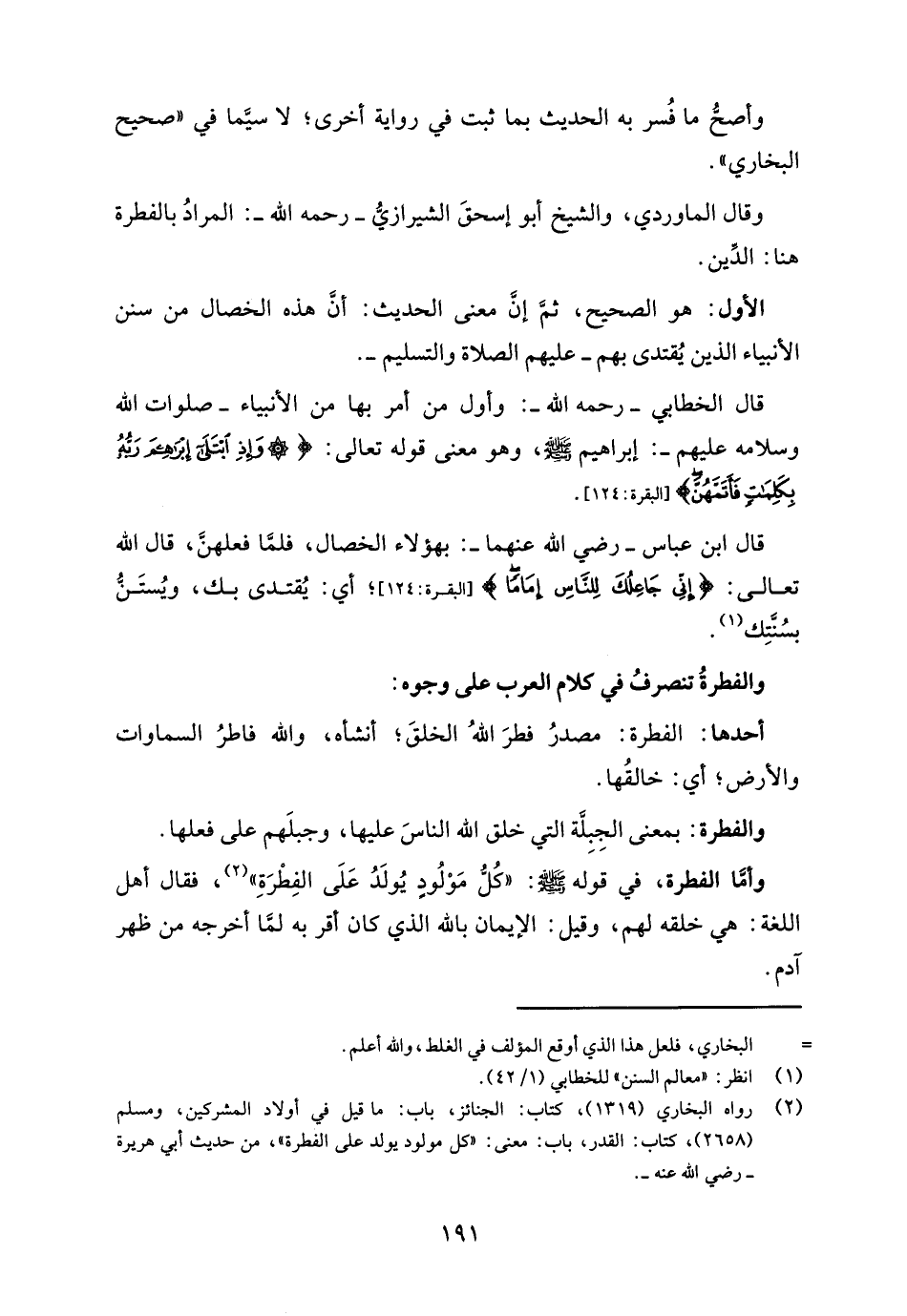 وقال الماوردي، والشيخ أبو إسحقَ الشيرازيُّ - رحمه الله -: المرادُ بالفطرة هنا: الدِّين.