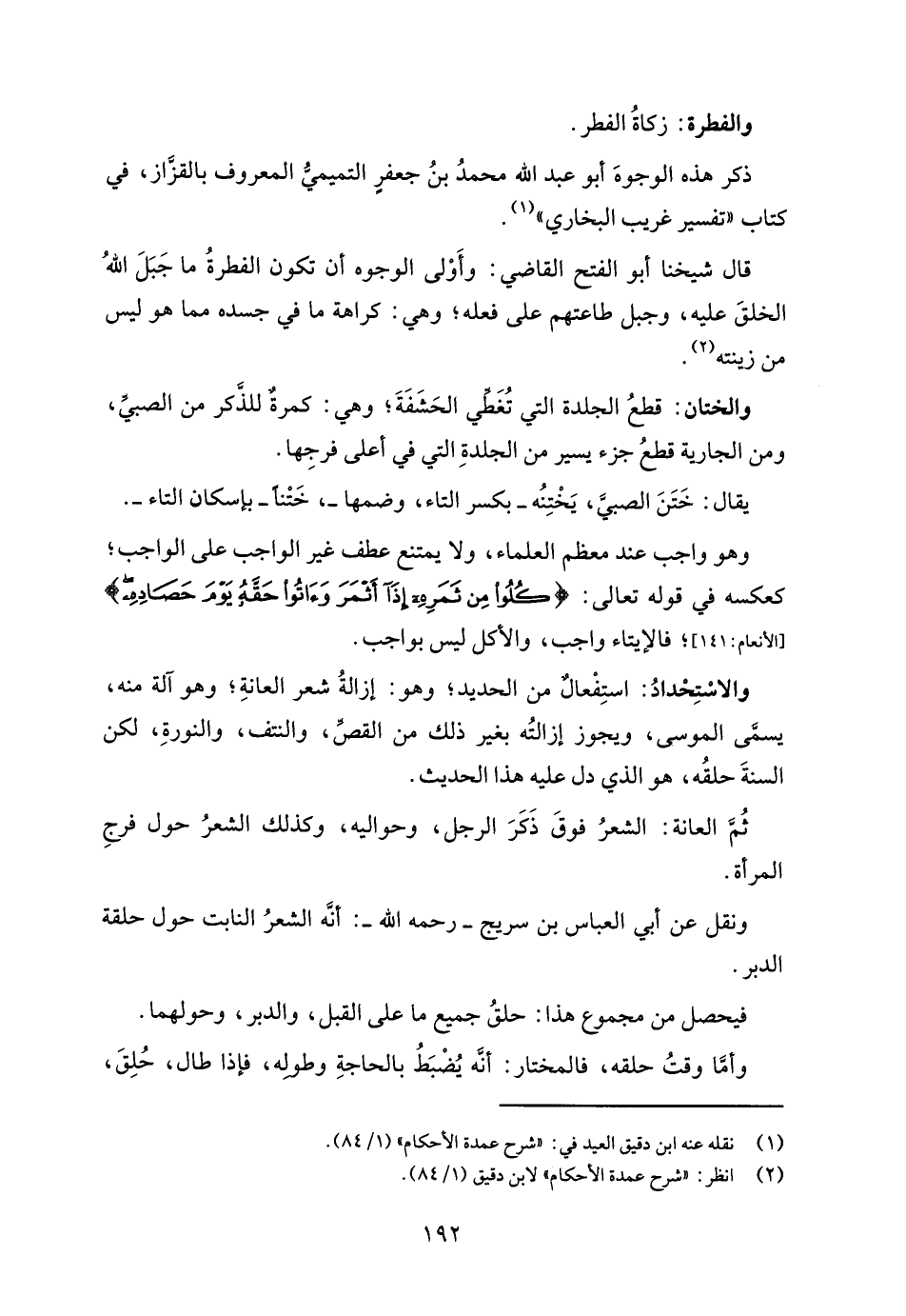 قال شيخنا أبو الفتح القاضي: وأَوْلى الوجوه أن تكون الفطرةُ ما جَبَلَ اللهُ الخلقَ عليه، وجبل طاعتهم على فعله؛ وهي: كراهة ما في جسده مما هو ليس من زينته (¬2).