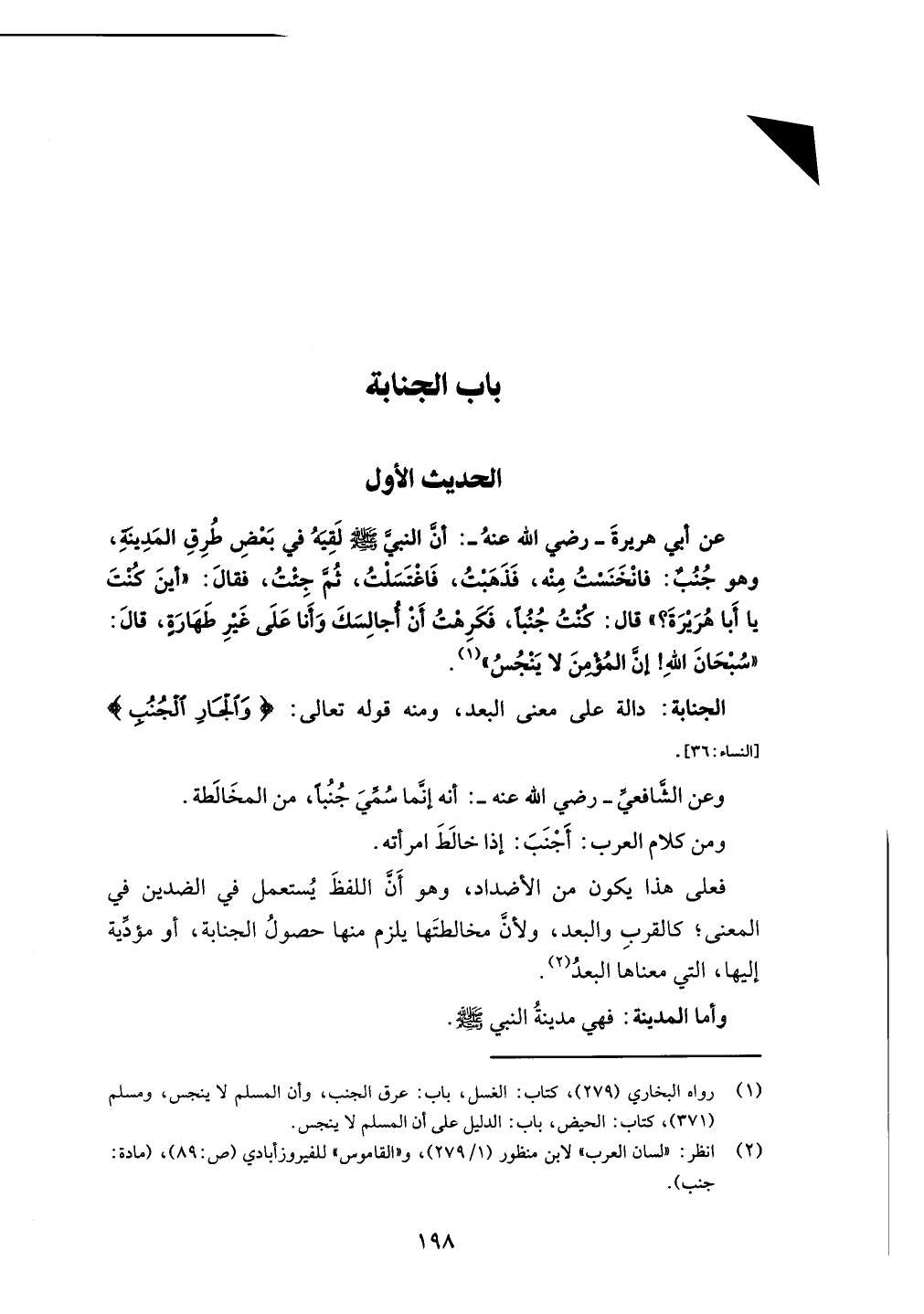 عن أبي هريرةَ - رضي الله عنهُ -: أنَّ النبيَّ - صلى الله عليه وسلم - لَقِيَهُ في بَعْضِ طُرِقِ المَدِينَةِ، وهو جُنُبٌ: فانْخَنَسْتُ مِنْه، فَذَهَبْتُ، فَاغْتَسَلْتُ، ثُمَّ جِئْتُ، فقالَ: "أينَ كُنْتَ يا أَبا هُرَيْرَةَ؟ " قال: كُنْتُ جُنُبًا، فكَرِهْتُ أَن أُجَالِسَكَ وَأَنَا عَلَى غَيْرِ طَهَارَةٍ، قَالَ: "سُبْحَانَ اللهِ! إنَّ المُؤمِنَ لا يَنْجُسُ" (¬1).