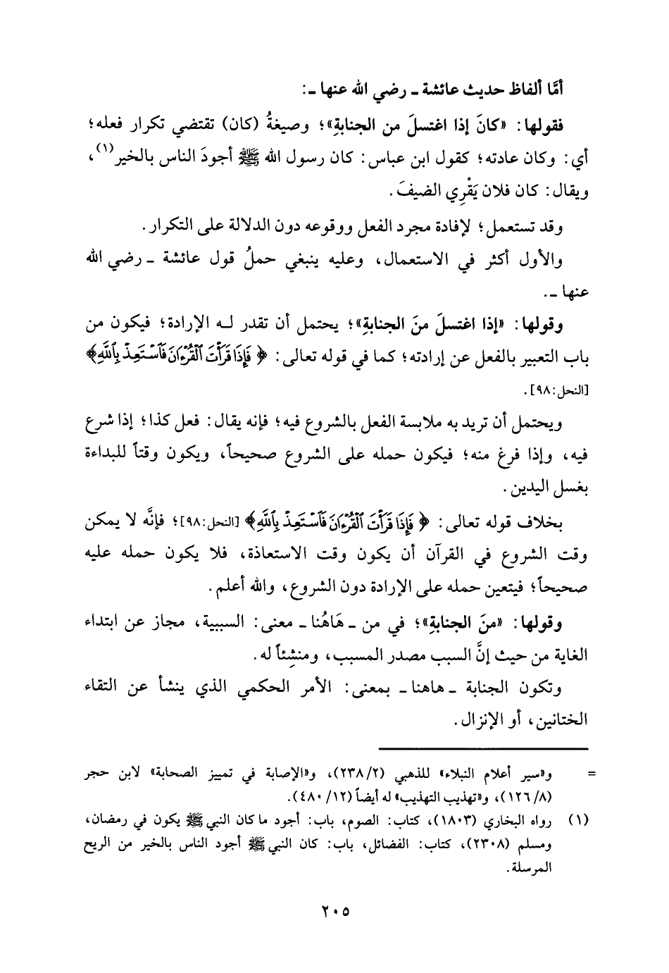 فقولها: "كانَ إذا اغتسلَ من الجنابةِ"؛ وصيغةُ (كان) تقتضي تكرار فعله؛ أي: وكان عادته؛ كقول ابن عباس: كان رسول الله - صلى الله عليه وسلم - أجودَ الناس بالخير (¬1)، ويقال: كان فلان يَقْرِي الضيفَ.