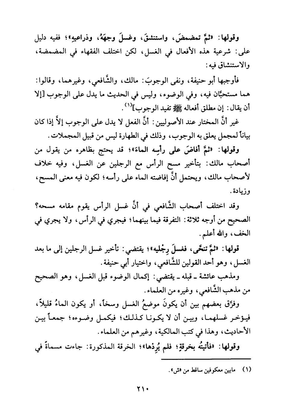 وقولها: "ثمَّ تمضمضَ، واستنشقَ، وغسلَ وجهَهُ، وذراعيهِ"؛ ففيه دليل على: شرعية هذه الأفعال في الغسل، لكن اختلف الفقهاء في المضمضة، والاستنشاق فيه: