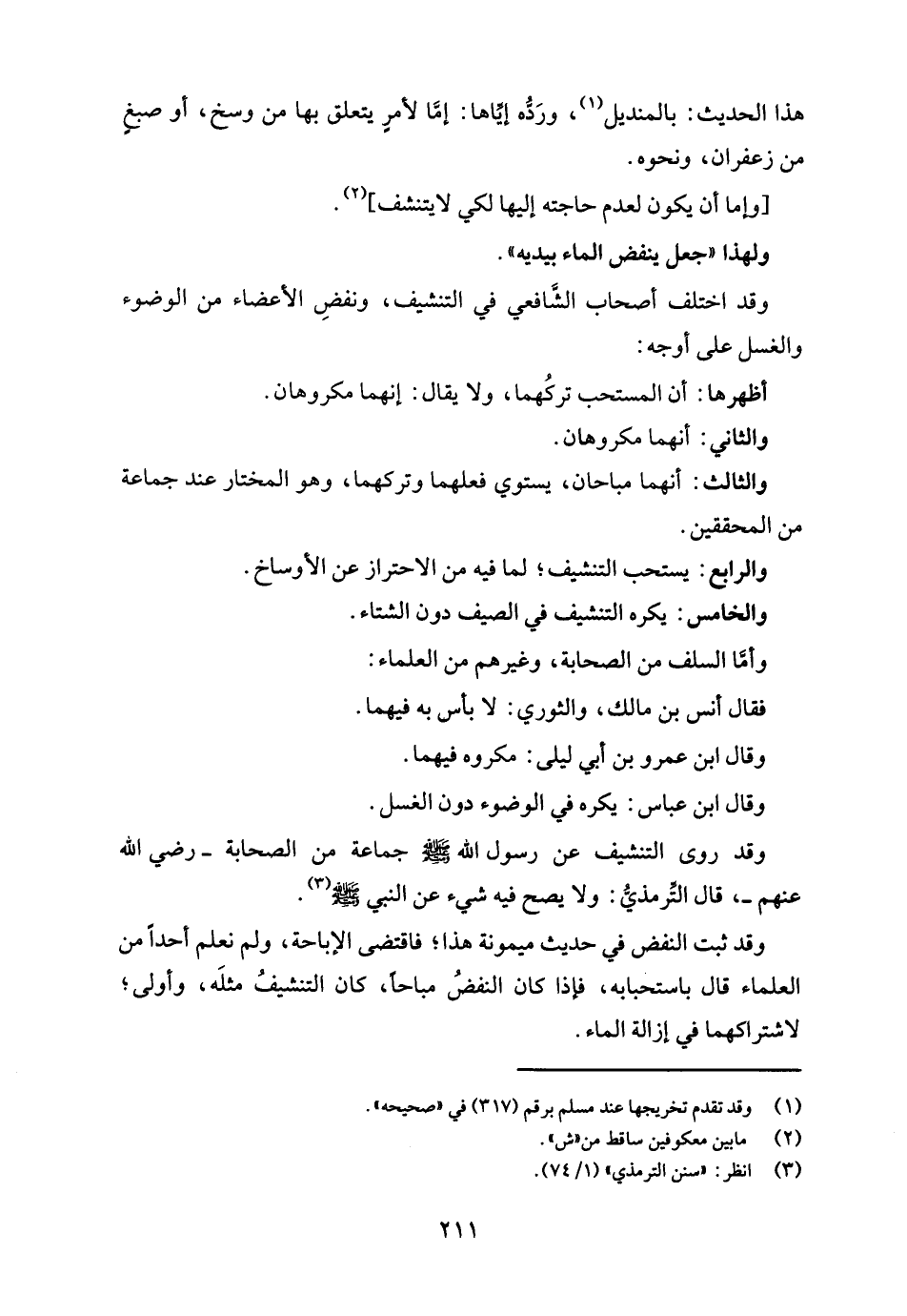 وقد اختلف أصحاب الشَّافعي في التنشيف، ونفضِ الأعضاء من الوضوء والغسل على أوجه: