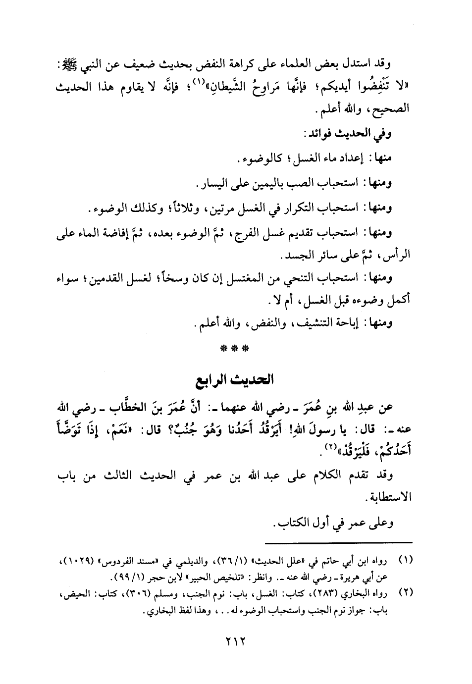 (¬2) رواه البخاري (283)، كتاب: الغسل، باب: نوم الجنب، ومسلم (306)، كتاب: الحيض، باب: جواز نوم الجنب واستحباب الوضوء له .. ، وهذا لفظ البخاري.