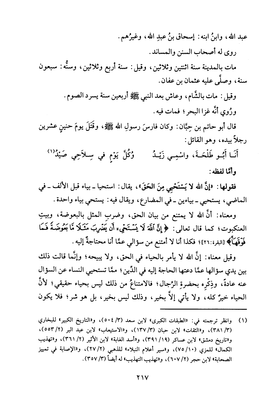 ومعناه: أن الله لا يمتنع من بيان الحق، وضربِ المثل بالبعوضة، وبيتِ العنكبوت؛ كما قال تعالى: {إِنَّ اللَّهَ لَا يَسْتَحْيِي أَنْ يَضْرِبَ مَثَلًا مَا بَعُوضَةً فَمَا فَوْقَهَا} [البقرة: 26]؛ فكذا أنا لا أمتنع من سؤالي عمَّا أنا محتاجةٌ إليه.