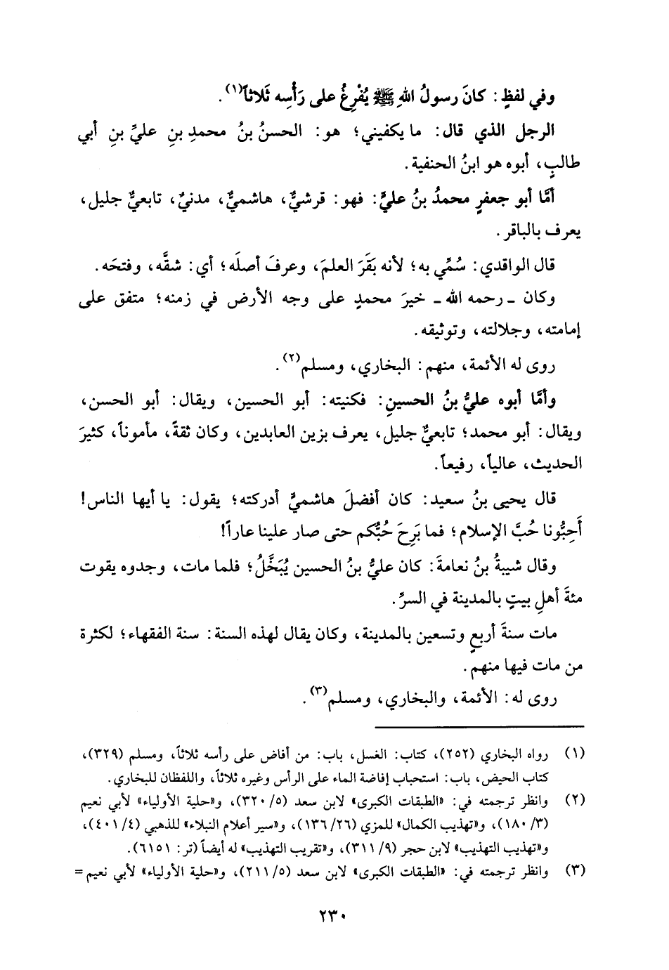 (¬1) رواه البخاري (252)، كتاب: الغسل، باب: من أفاض على رأسه ثلاثًا، ومسلم (329)، كتاب الحيض، باب: استحباب إفاضة الماء على الرأس وغيره ثلاثًا، واللفظان للبخاري.