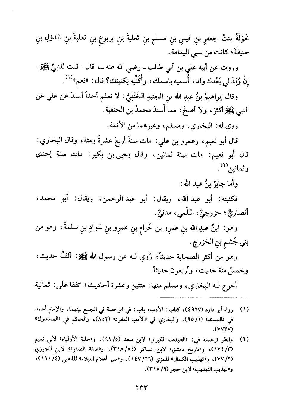فكنيته: أبو عبد الله، ويقال: أبو عبد الرحمن، ويقال: أبو محمد، أنصاريٌّ؛ خزرجيٌّ، سُلَمي، مدنيٌّ.