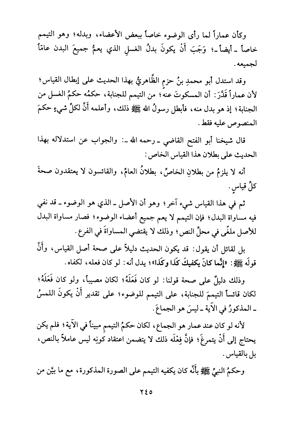 وقد استدل أبو محمدِ بنُ حزمٍ الظَّاهريُّ بهذا الحديث على إبطال القياس؛ لأن عمارًا قَدَّرَ: أن المسكوتَ عنه؛ من التيمم للجنابة، حكمُه حكمُ الغسل من الجنابة؛ إذ هو بدل منه، فأبطل رسولُ الله - صلى الله عليه وسلم - ذلك، وأعلمه أَن لكلِّ شيءٍ حكمَ المنصوص عليه فقط.