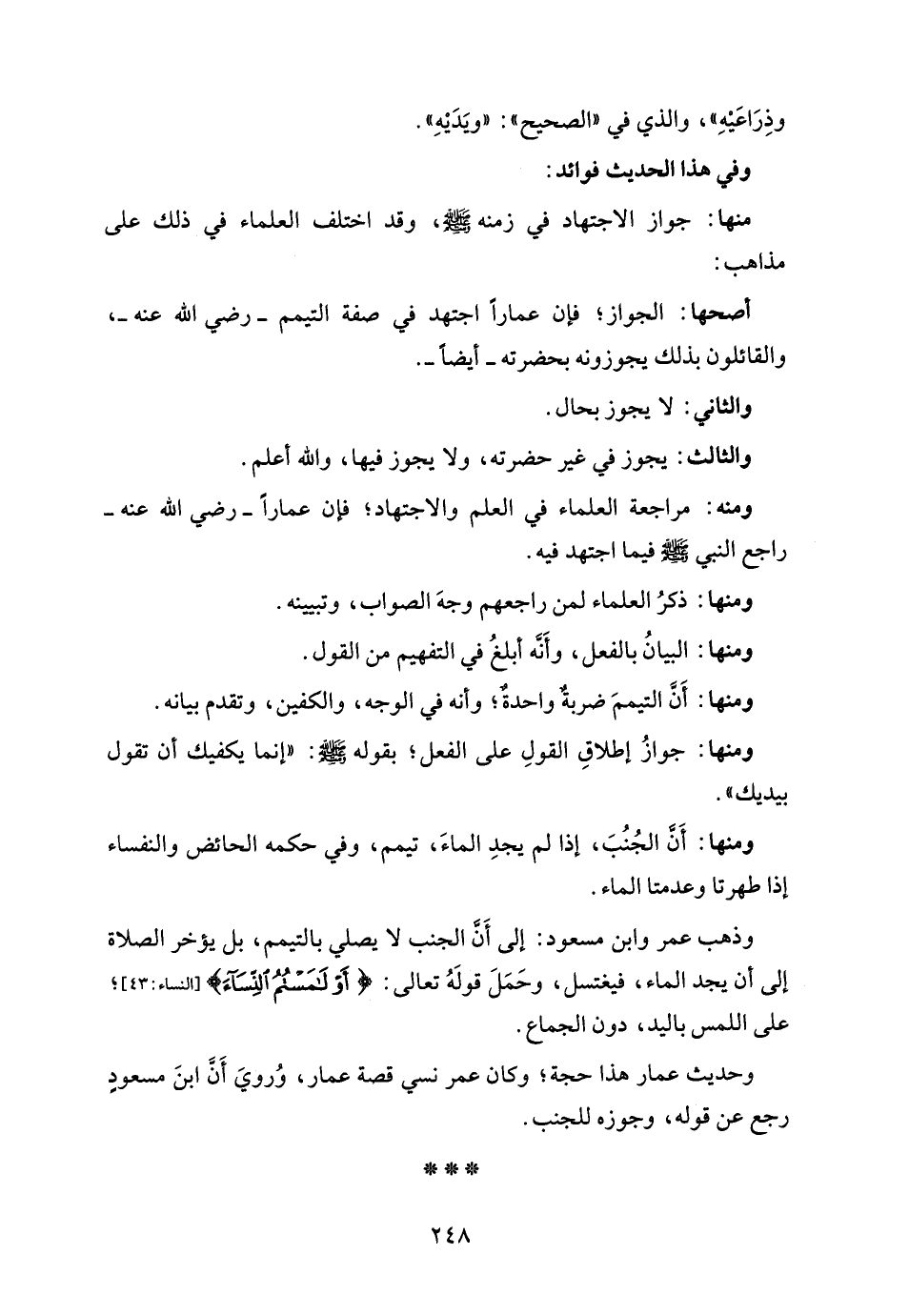 وحديث عمار هذا حجة؛ وكان عمر نسي قصة عمار، وُرويَ أَنَّ ابنَ مسعودِ رجع عن قوله، وجوزه للجنب.