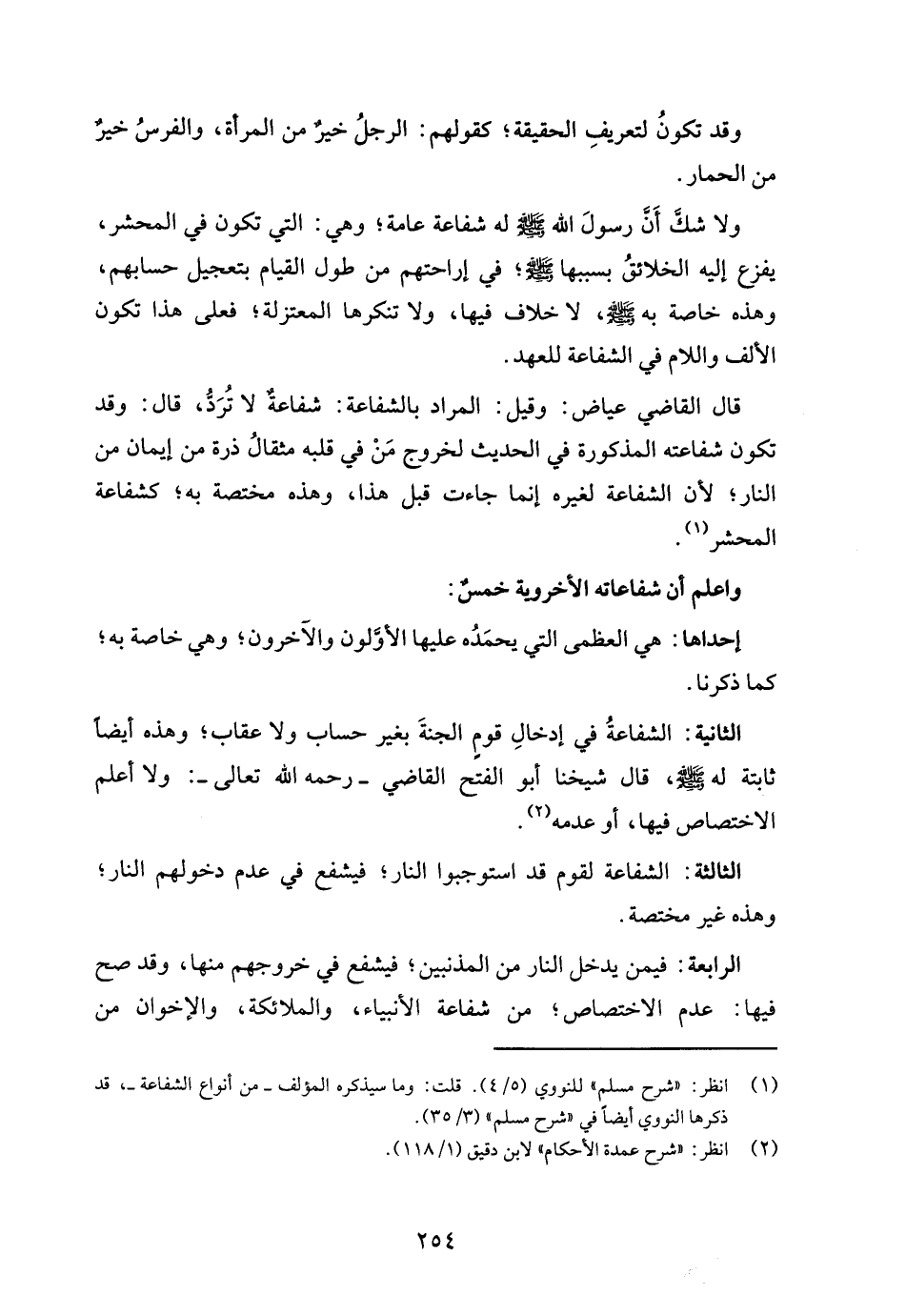 (¬1) انظر: "شرح مسلم" للنووي (5/ 4). قلت: وما سيذكره المؤلف -من أنواع الشفاعة-، قد ذكرها النووي أيضًا في "شرح مسلم" (3/ 35).
