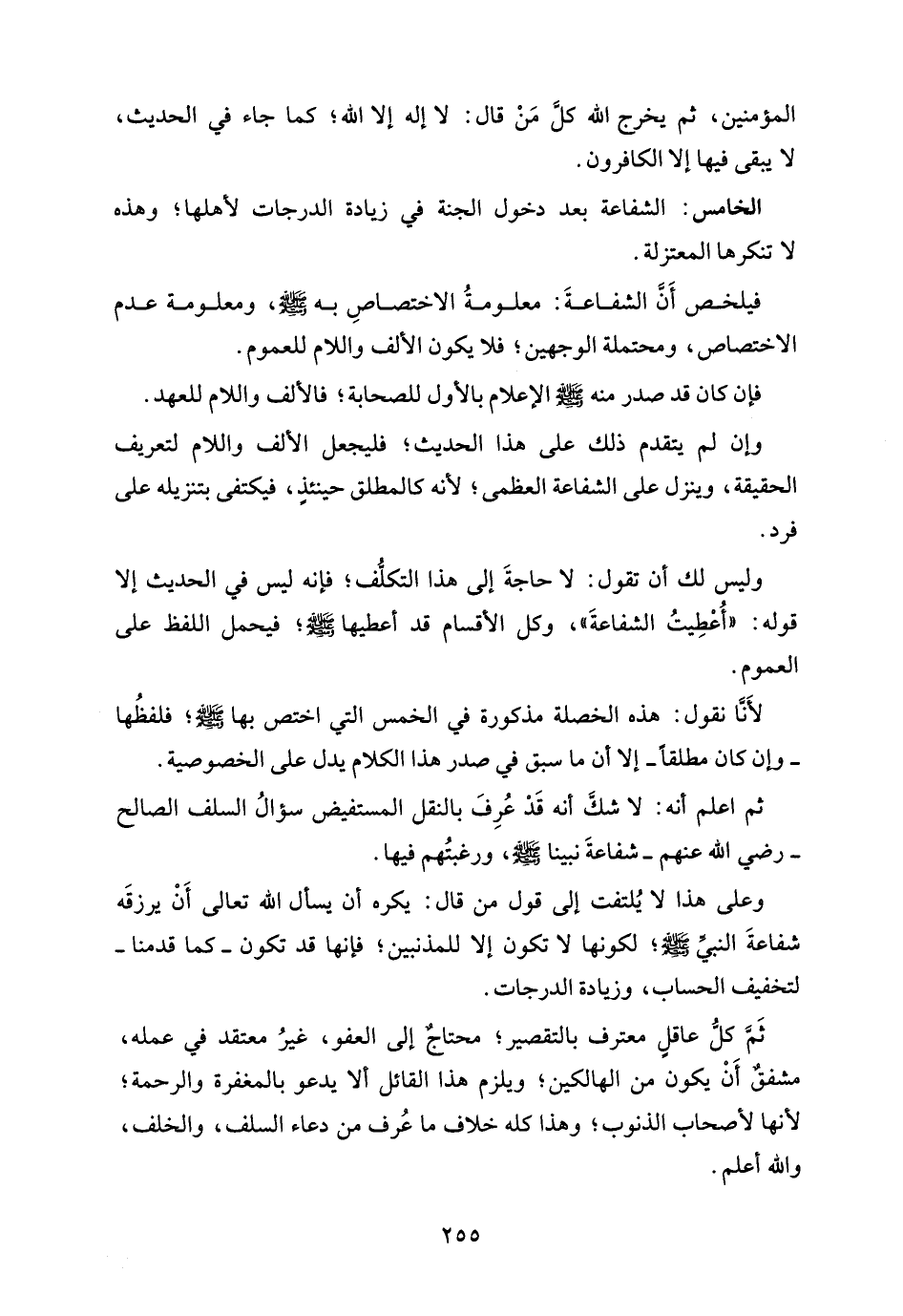فيلخص أَنَّ الشفاعةَ: معلومةُ الاختصاصِ به - صلى الله عليه وسلم -، ومعلومة عدم الاختصاص، ومحتملة الوجهين؛ فلا يكون الألف واللام للعموم.