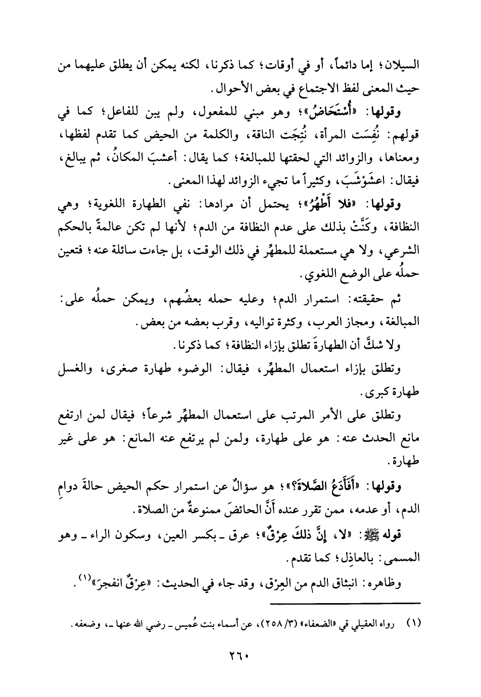 وقولها: "أُسْتَحَاضُ"؛ وهو مبني للمفعول، ولم يبن للفاعل؛ كما في قولهم: نُفِسَت المرأة، نُتِجَت الناقة، والكلمة من الحيض كما تقدم لفظها، ومعناها، والزوائد التي لحقتها للمبالغة؛ كما يقال: أعشبَ المكانُ، ثم يبالغ، فيقال: اعشَوْشَبَ، وكثيرًا ما تجيء الزوائد لهذا المعنى.