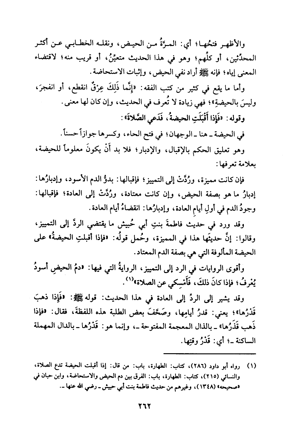 (¬1) رواه أبو داود (286)، كتاب: الطهارة، باب: من قال: إذا أقبلت الحيضة تدع الصلاة، والنسائي (215)، كتاب: الطهارة، باب: الفرق بين دم الحيض والاستحاضة، وابن حبان في "صحيحه" (1348)، وغيرهم من حديث فاطمة بنت أبي حبيش - رضي الله عنها -.