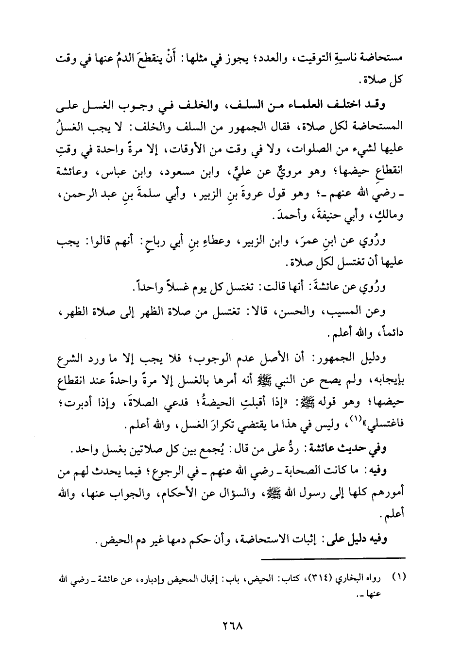 وقد اختلف العلماء من السلف، والخلف في وجوب الغسل على المستحاضة لكل صلاة، فقال الجمهور من السلف والخلف: لا يجب الغسلُ عليها لشيء من الصلوات، ولا في وقت من الأوقات، إلا مرةً واحدة في وقتِ انقطاعِ حيضها؛ وهو مرويٌّ عن عليٍّ، وابن مسعود، وابن عباس، وعائشة -رضي الله عنهم-؛ وهو قول عروةَ بنِ الزبير، وأبي سلمةَ بنِ عبد الرحمن، ومالكٍ، وأبي حنيفةَ، وأحمدَ.