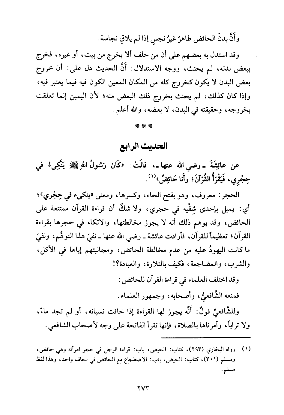 عن عائشِةَ - رضي الله عنها -، قالَتْ: "كَان رَسُولُ اللهِ - صلى الله عليه وسلم - يَتَّكِئُ في حِجْرِي، فَيَقْرَأُ القُرْآنَ؛ وأَنا حَائِضٌ" (¬1).