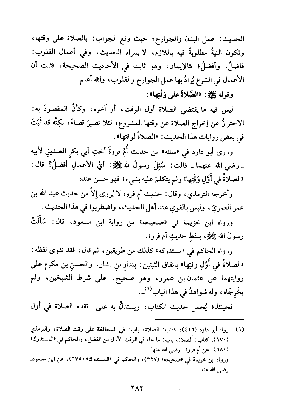 وقوله - صلى الله عليه وسلم -: "الصَّلاةُ على وَقْتِها":