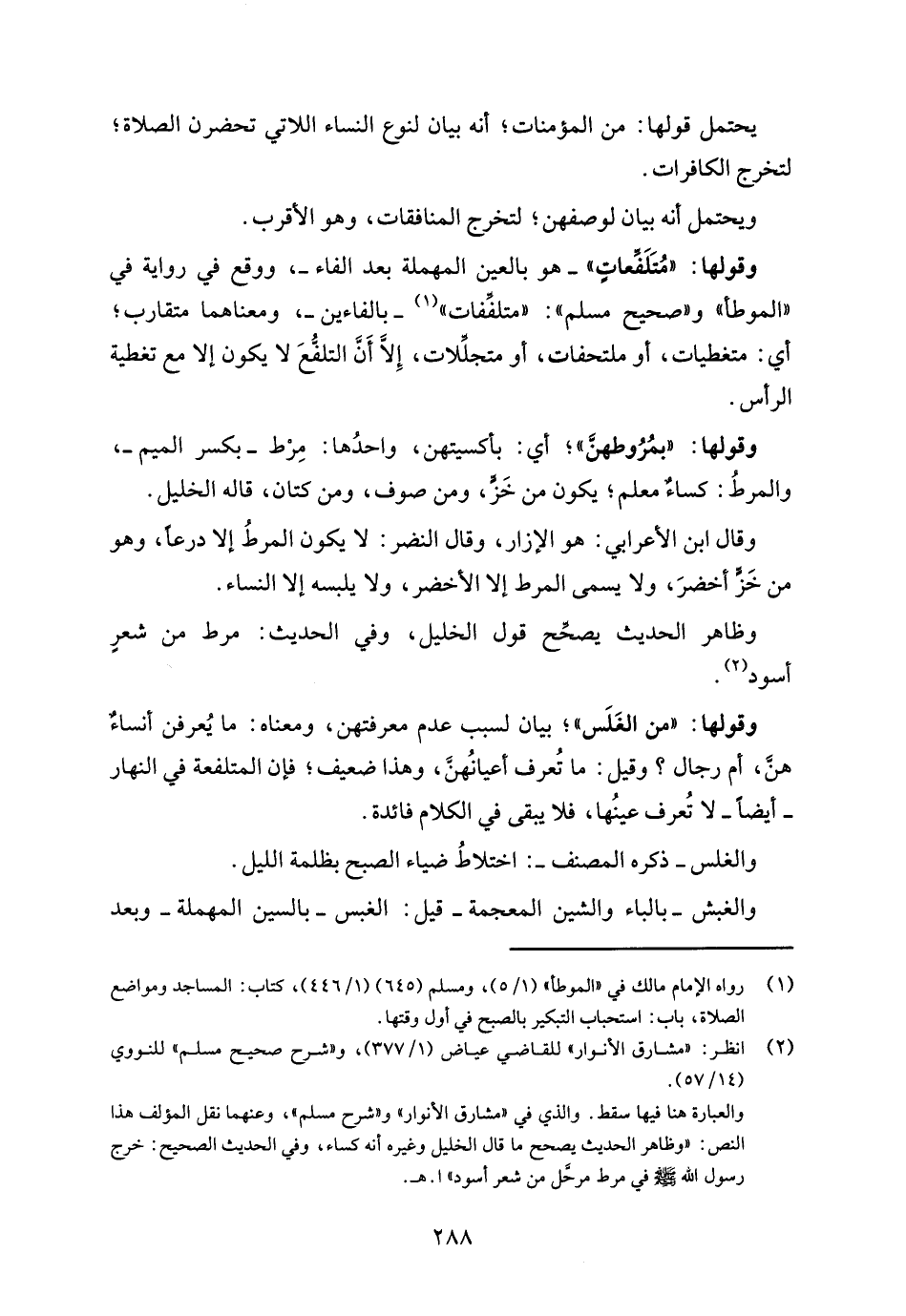 وقولها: "مُتَلَفِّعاتٍ" -هو بالعين المهملة بعد الفاء-، ووقع في رواية في "الموطأ" و"صحيح مسلم": "متلفِّفات" (¬1) -بالفاءين-، ومعناهما متقارب؛ أي: متغطيات، أو ملتحفات، أو متجلِّلات، إلَّا أَنَّ التلفُّعَ لا يكون إلا مع تغطية الرأس.