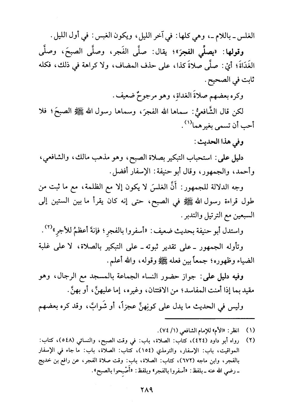 (¬2) رواه أبو داود (424)، كتاب: الصلاة، باب: في وقت الصبح، والنسائي (548)، كتاب: المواقيت، باب: الإسفار، والترمذي (154)، كتاب: الصلاة، باب: ما جاء في الإسفار بالفجر، وابن ماجه (672)، كتاب: الصلاة، باب: وقت صلاة الفجر، عن رافع بن خديج - رضي الله عنه - بلفظ: "أسفروا بالفجر" وبلفظ: "أَصْبِحوا بالصبح".