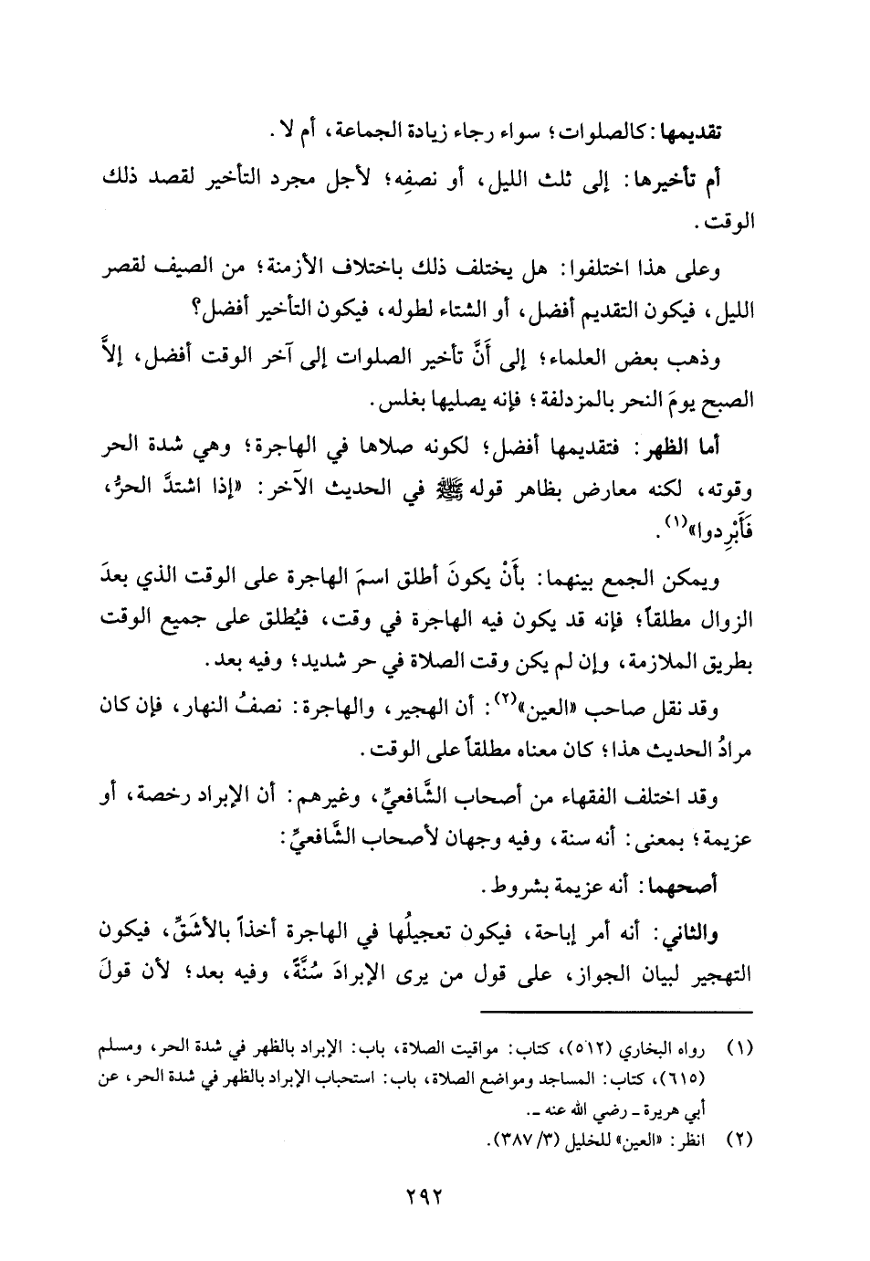 وقد اختلف الفقهاء من أصحاب الشَّافعيِّ، وغيرهم: أن الإبراد رخصة، أو عزيمة؛ بمعنى: أنه سنة، وفيه وجهان لأصحاب الشَّافعيِّ: